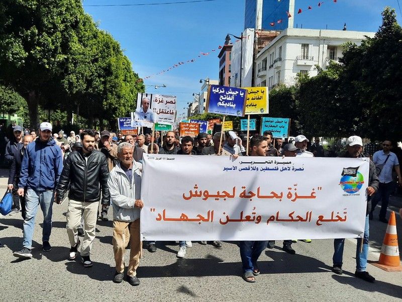 خرجت بالعاصمة تونس يوم الجمعة 13 شوال الخير 1446هـ الموافق 11 نيسان/أبريل 2025م مسيرة حزب التحرير / ولاية تونس عقب صلاة الجمعة انطلاقا من جامع الفتح مسيرة حزب التحرير نصرة لأهل فلسطين وللأقصى الأسير والتي كان قد دعى لها أهل تونس الزيتونة تحت عنوان "غزة بحاجة لجيوش تخلع الحكام وتعلن الجهاد" وحضر هذه المسيرة حشد كبير من أهل تونس الخضراء التي جابت الشوارع الرئيسية للعاصمة تونس وصولا إلى شارع الثورة ورفعت خلالها لافتات كتب فيها على اللافتة الرئيسية عنوان المسيرة ورفعت لافتة أخرى كتب عليها "51600 شهيد 18 ألف من الأطفال و12 ألف من النساء. فماذا أنتم فاعلون يا جيوش المسلمين؟"... كما رفعت العشرات من اللافتات تستنصر جيوش المسلمين في بلاد المسلمين لنصرة إخوانهم في فلسطين، وتخلل المسيرة شعارات رددها الحضور الكبير مثل "الأمة تريد إعلان الجهاد"، "الأمة تريد إسقاط العروش"، "الأمة تريد كسر الحدود" وغيرها من الشعارات التي في أغلبها تخاطب الضباط والجنود في جيوش المسلمين تذكرهم بواجبهم تجاه إخوانهم المستضعفين في غزة واختتمت بكلمة ألقاها أحد شباب حزب التحرير ذكّر فيها جيوش المسلمين بضرورة نصرة إخوانهم في فلسطين بعد إسقاط عروش الحكّام الظلمة.