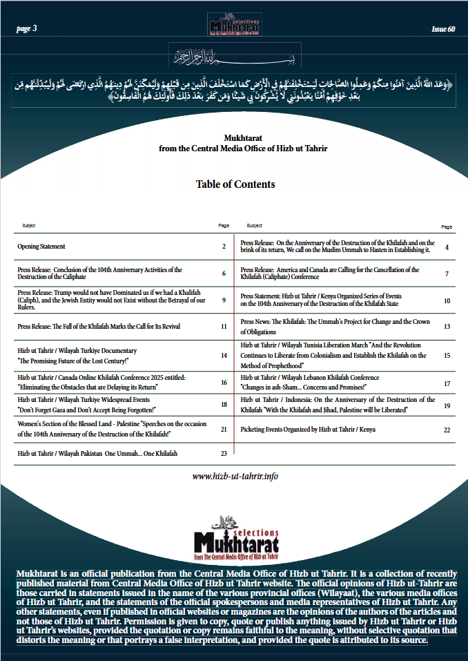 1 Ramadan 1446 | Saturday, 01 March 2025م Be the first to comment! font size decrease font size increase font size بسم الله الرحمن الرحيم Mukhtarat Magazine from The Central Media Office of Hizb ut Tahrir Issue 60 Ramadhan 1446 AH - March 2025 CE Click Here to View Click Here for PDF Click Here to Print More in this category: « Mukhtarat Magazine Issue 59 Ramadhan 1445 AH - April 2024 CE Mukhtarat Magazine Issue No 61 October 2025 » Leave a comment Make sure you enter the (*) required information where indicated. HTML code is not allowed. Name * Email * Website URL Enter the two words you see below Message * enter your message here... back to top