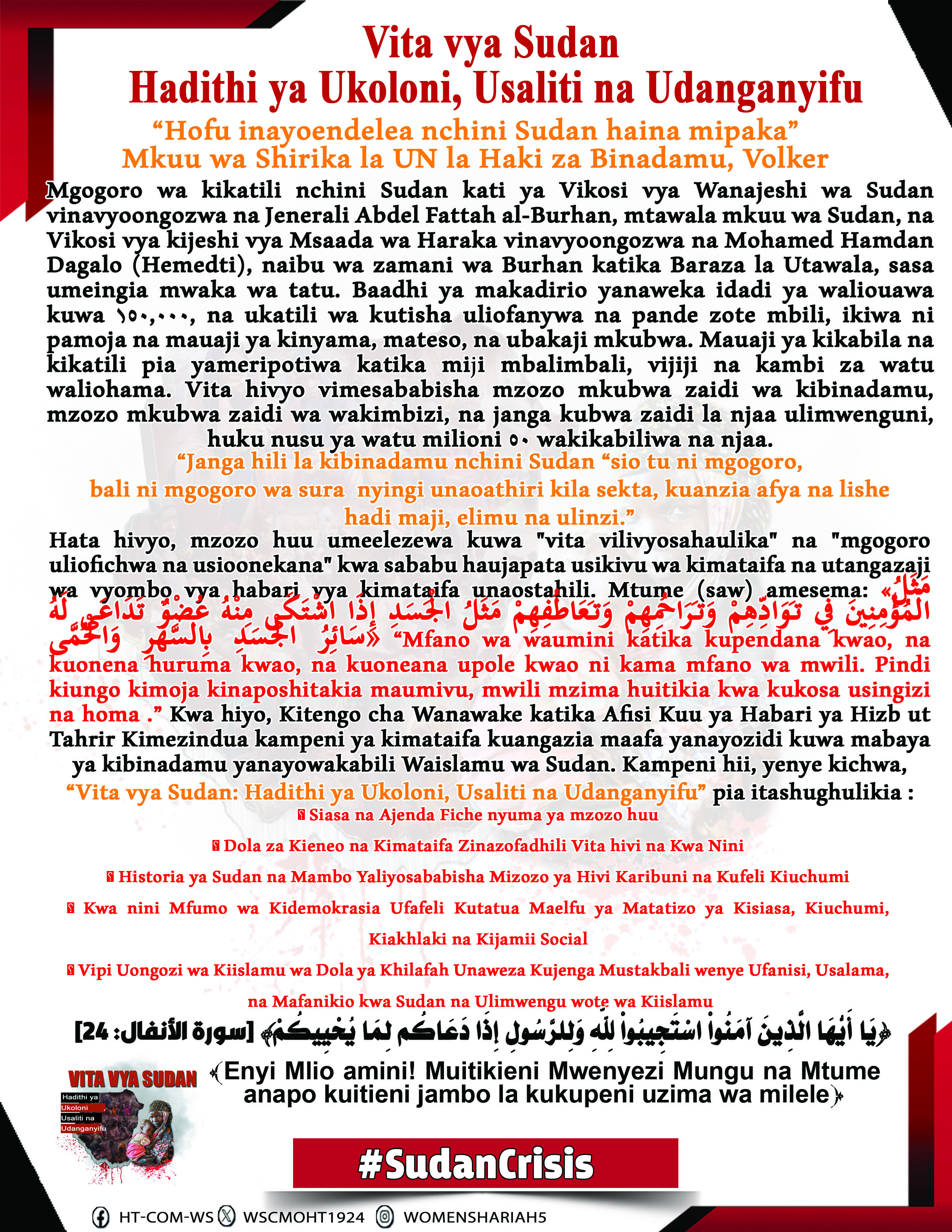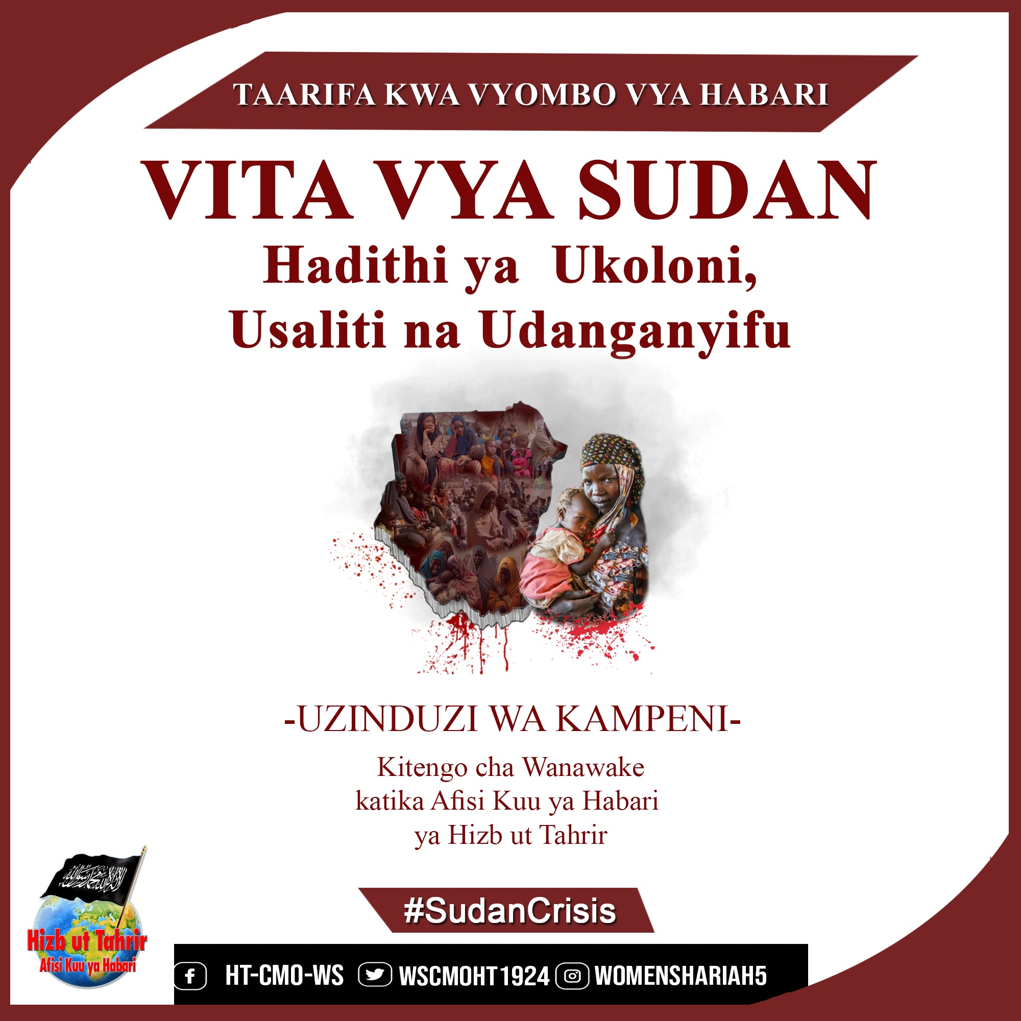 Mgogoro wa kikatili nchini Sudan kati ya Vikosi vya Wanajeshi wa Sudan vinavyoongozwa na Jenerali Abdel Fattah al-Burhan, mtawala mkuu wa Sudan, na Vikosi vya kijeshi vya Msaada wa Haraka vinavyoongozwa na Mohamed Hamdan Dagalo (Hemedti), naibu wa zamani wa Burhan katika Baraza la Utawala, sasa umeingia mwaka wa tatu. Baadhi ya makadirio yanaweka idadi ya waliouawa kuwa 150,000, na ukatili wa kutisha uliofanywa na pande zote mbili, ikiwa ni pamoja na mauaji ya kinyama, mateso, na ubakaji mkubwa. Mauaji ya kikabila na kikatili pia yameripotiwa katika miji mbalimbali, vijiji na kambi za watu waliohama. Vita hivyo vimesababisha mzozo mkubwa zaidi wa kibinadamu, mzozo mkubwa zaidi wa wakimbizi, na janga kubwa zaidi la njaa ulimwenguni, huku nusu ya watu milioni 50 wakikabiliwa na njaa. Hata hivyo, mzozo huu umeelezewa kuwa "vita vilivyosahaulika" na "mgogoro uliofichwa na usioonekana" kwa sababu haujapata usikivu wa kimataifa na utangazaji wa vyombo vya habari vya kimataifa unaostahili. Kwa hiyo, Kitengo cha Wanawake katika Afisi Kuu ya Habari ya Hizb ut Tahrir Kimezindua kampeni ya kimataifa kuangazia maafa yanayozidi kuwa mabaya ya kibinadamu yanayowakabili Waislamu wa Sudan. Kampeni hii pia itashughulikia: siasa na ajenda zilizofichwa nyuma ya mzozo huu, dola za kikanda na kimataifa zinazofadhili vita na sababu zake, historia ya Sudan na mambo yaliyosababisha migogoro ya hivi karibuni na kufeli kiuchumi, kwa nini mfumo wa kidemokrasia umefeli kutatua matatizo mengi ya kisiasa, kiuchumi, kikabila na kijamii ya Sudan, na jinsi uongozi wa Kiislamu wa Dola ya Khilafah Rashida, unaweza kujenga mustakabali mzuri wa Sudan na nchi nyingine za Kiislamu zenye mafanikio.