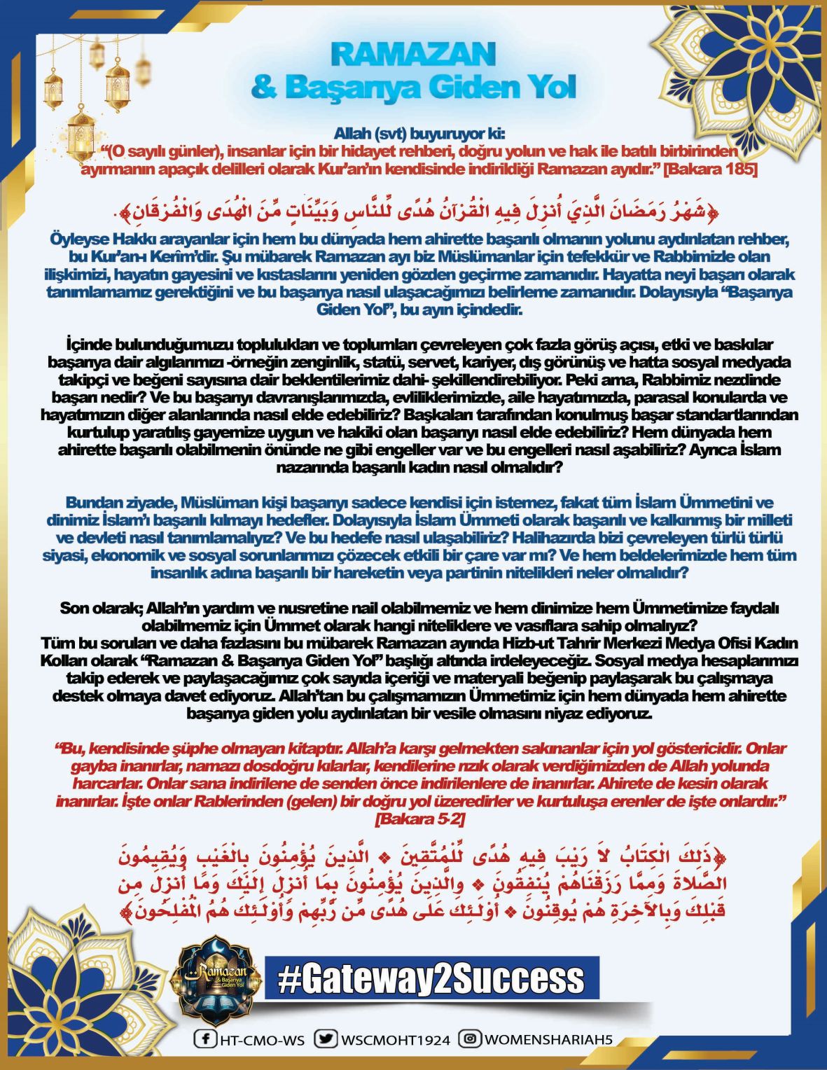 Tüm bu soruları ve daha fazlasına bu mübarek Ramazan ayında Hizb-ut Tahrir Merkezi Medya Ofisi Kadın Kolları olarak, “Ramazan & Başarıya Giden Yol” başlığı altında irdeleyeceğiz. Çalışmamızı aşağıdaki link üzerinden takip edebilirsiniz. Allah’tan bu çalışmamızın Ümmetimiz için hem dünyada hem ahirette başarıya giden yolu aydınlatan bir vesile olmasını niyaz ediyoruz.