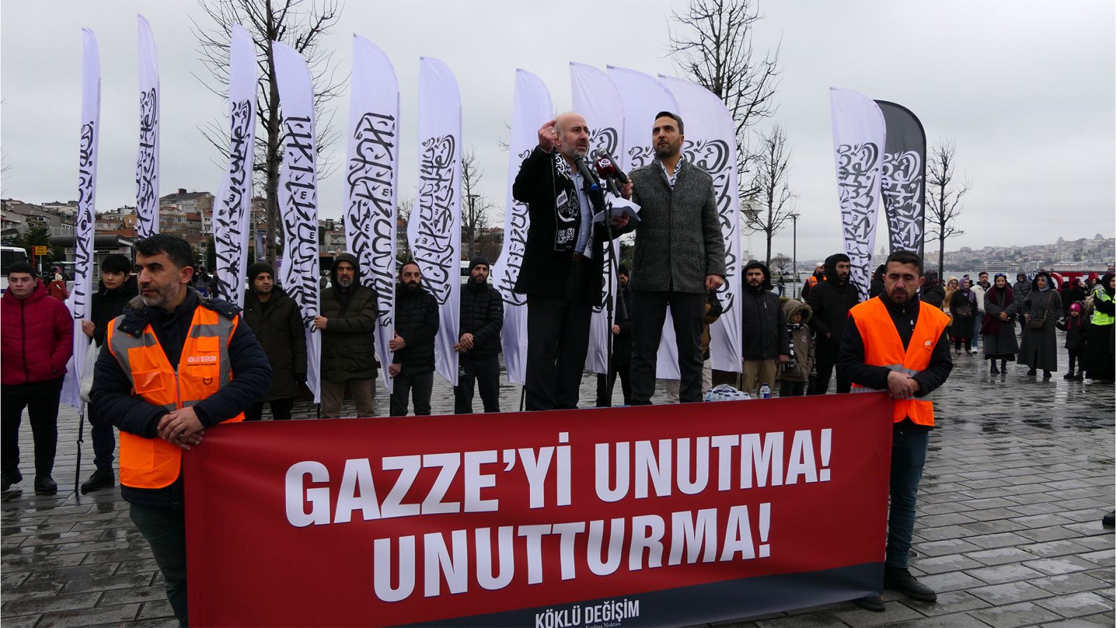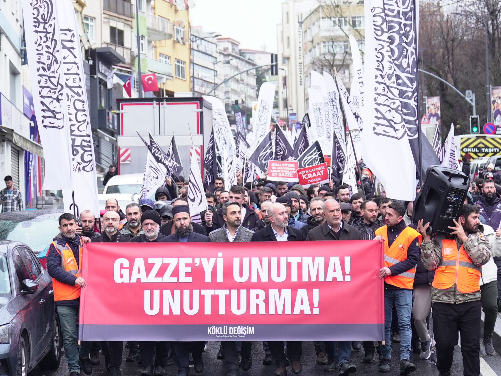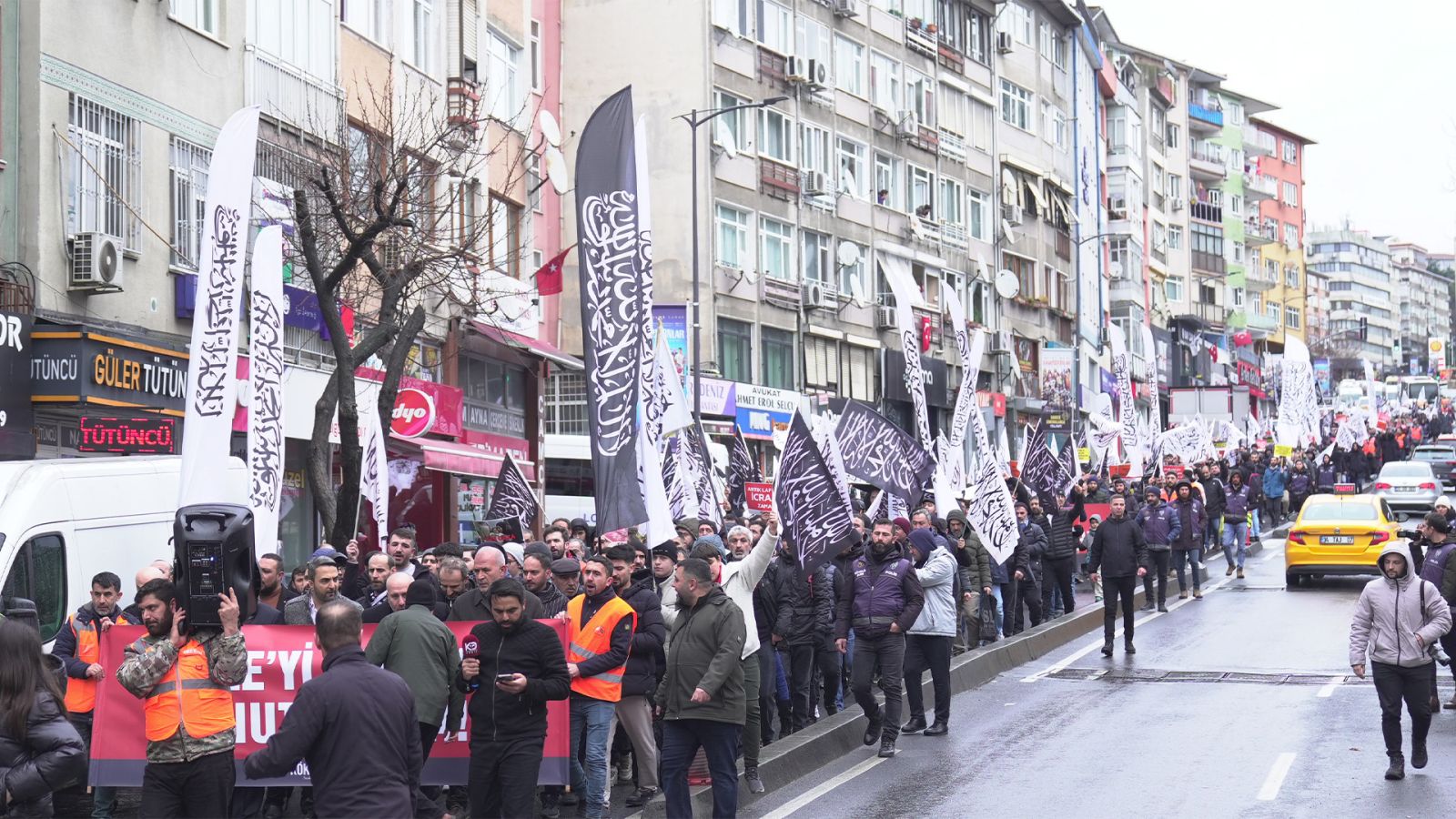 Gazze’ye destek mesajları içeren pankartların taşındığı yürüyüşte yol boyunca tekbirler getirilerek Gazze direnişi selamlandı ve “Ordular Aksa’ya” sloganları atıldı.