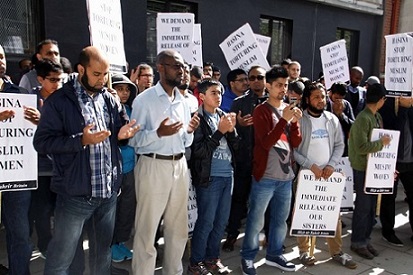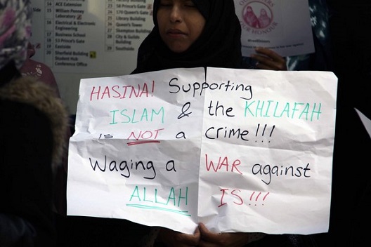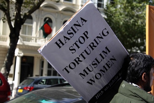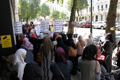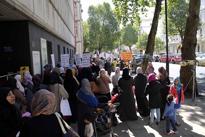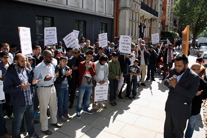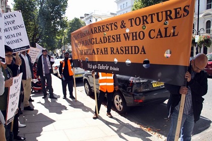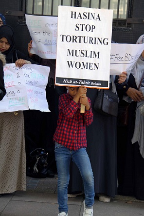 نظم حزب التحرير / بريطانيا وقفة أمام السفارة البنغالية في لندن احتجاجاً على اعتقال نظام الشيخة حسنية عضوتين من أعضاء حزب التحرير اللتين اعتقلتا بذريعة توزيعهن دعوات لحضور مؤتمر سياسي إسلامي نظمه الحزب على شبكة الإنترنت! وطالب المحتجون بإطلاق سراح الأختين فورا..