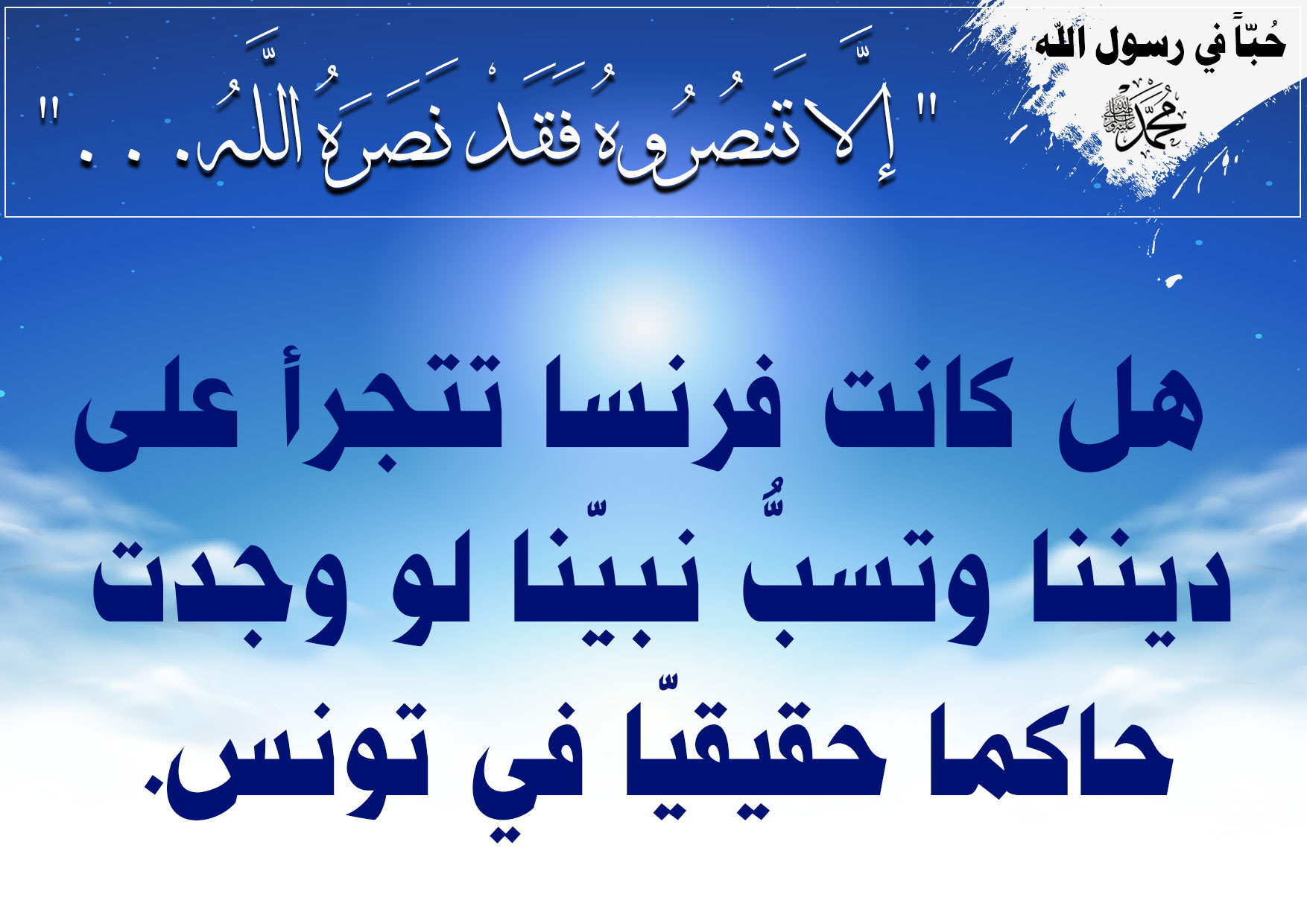 وتزامنا مع نشاط الحزب في العاصمة، فقد سجل شباب حزب التحرير في القيروان حضورهم بتنفيذ وقفة مناهضة لممارسات فرنسا العدائية تجاه نبي الأمة ﷺ وذلك في باب الجلادين، حيث كان فيها للأخ عز الدين عويشاوي كلمة ذكر فيها بجرائم فرنسا وبرد دولة الخلافة أيام السلطان عبد الحميد الثاني ودعا فيها أبناء تونس وعلى رأسهم أهل القوة والمنعة للوقوف إلى جانبنا في نصرة هذا الدين ونصرة رسولنا الكريم ﷺ بإقامة دولة تطبق شرع الله وتهتدي بهدي رسول الله ﷺ. كما تم توزيع الهمسات على الناس للتذكير بوجوب نصرة الإسلام ونبي الإسلام بإقامة دولة الإسلام، دولة الخلافة الراشدة الثانية على منهاج النبوة.