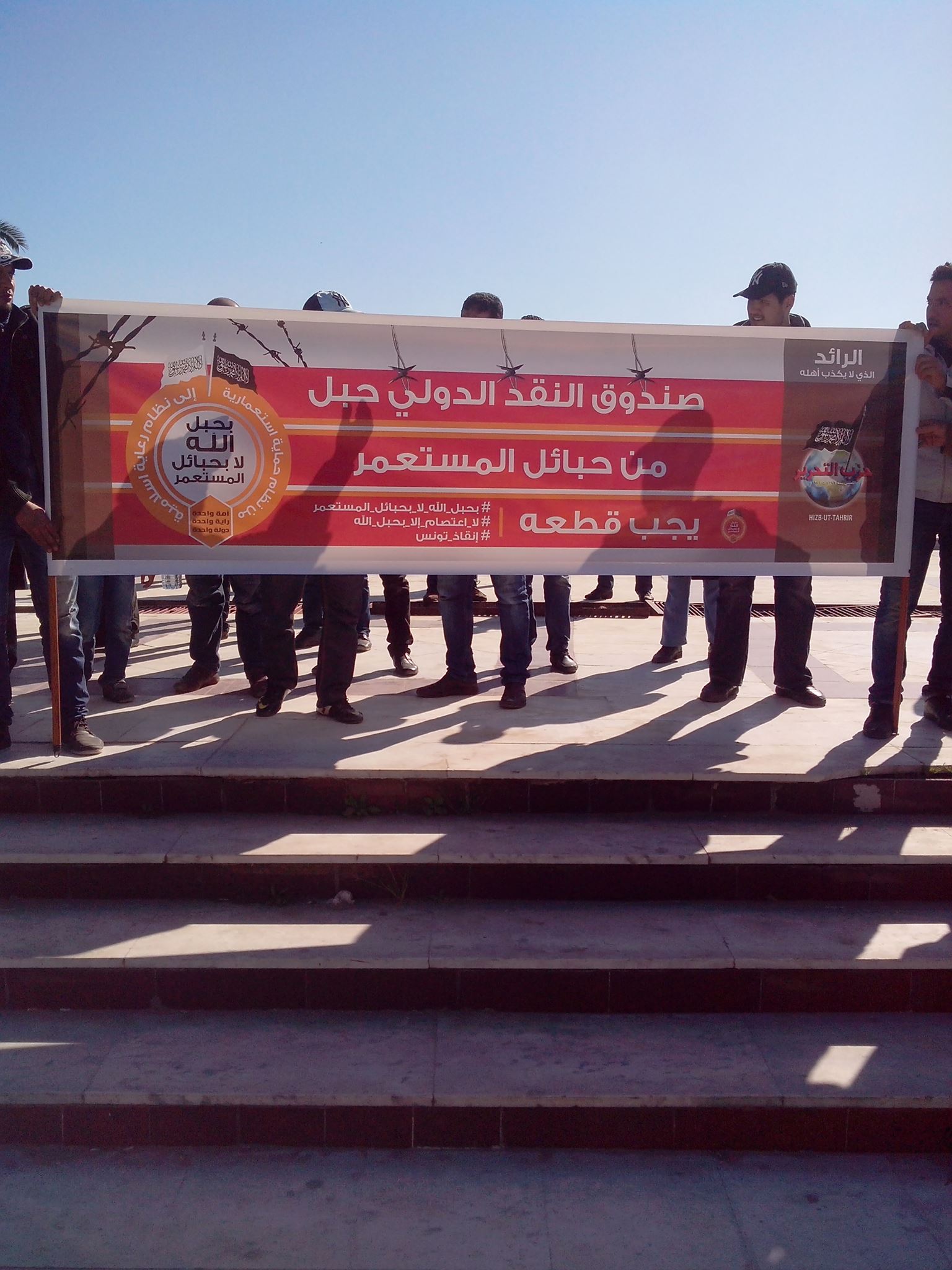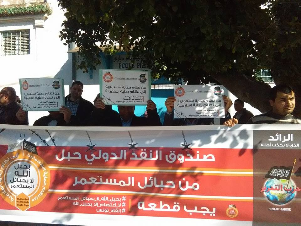ضمن حملة "بحبل الله لا بحبائل المستعمر" نظم حزب التحرير / ولاية تونس وقفة احتجاجية أمام مجلس نواب الشعب رفضاً لزيارة وفد صندوق النقد الدولي لتونس ورفضا لسياسة السلطة في الاقتراض ورهن البلاد.