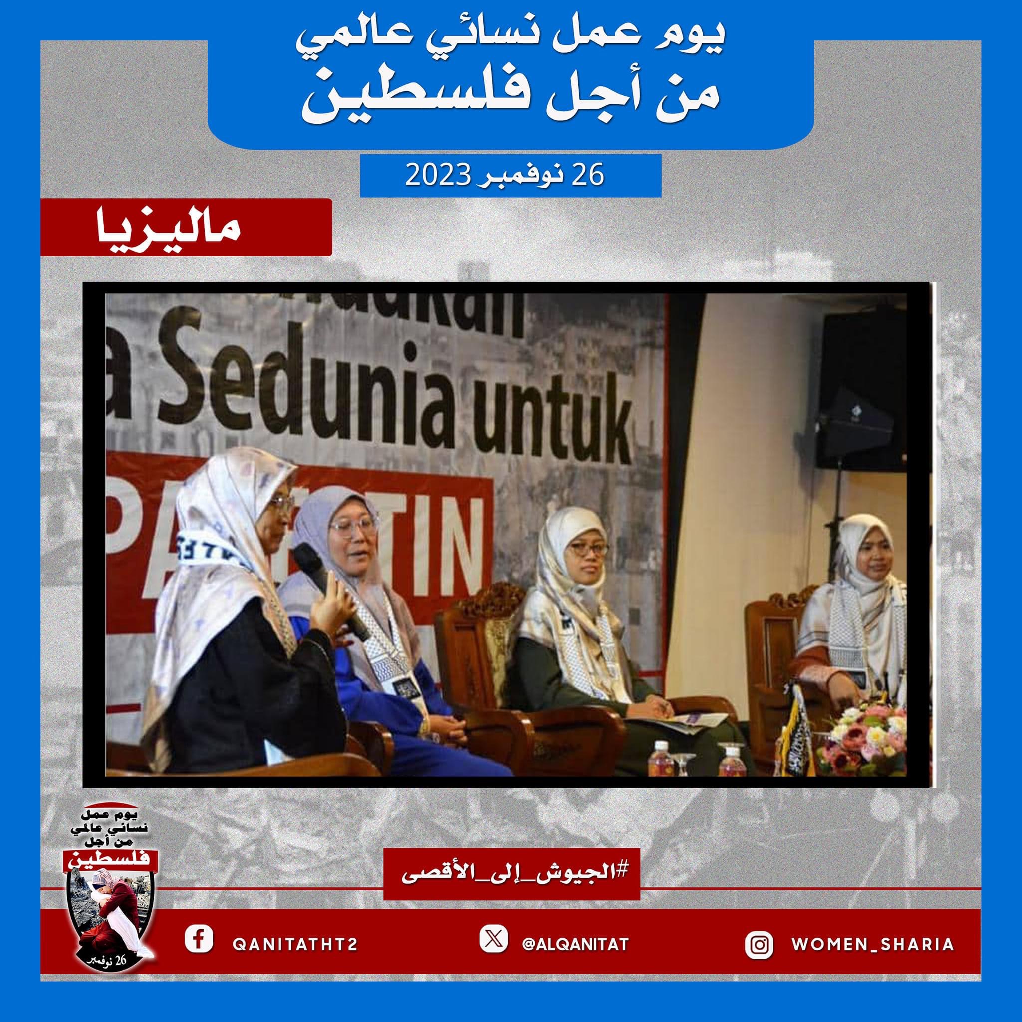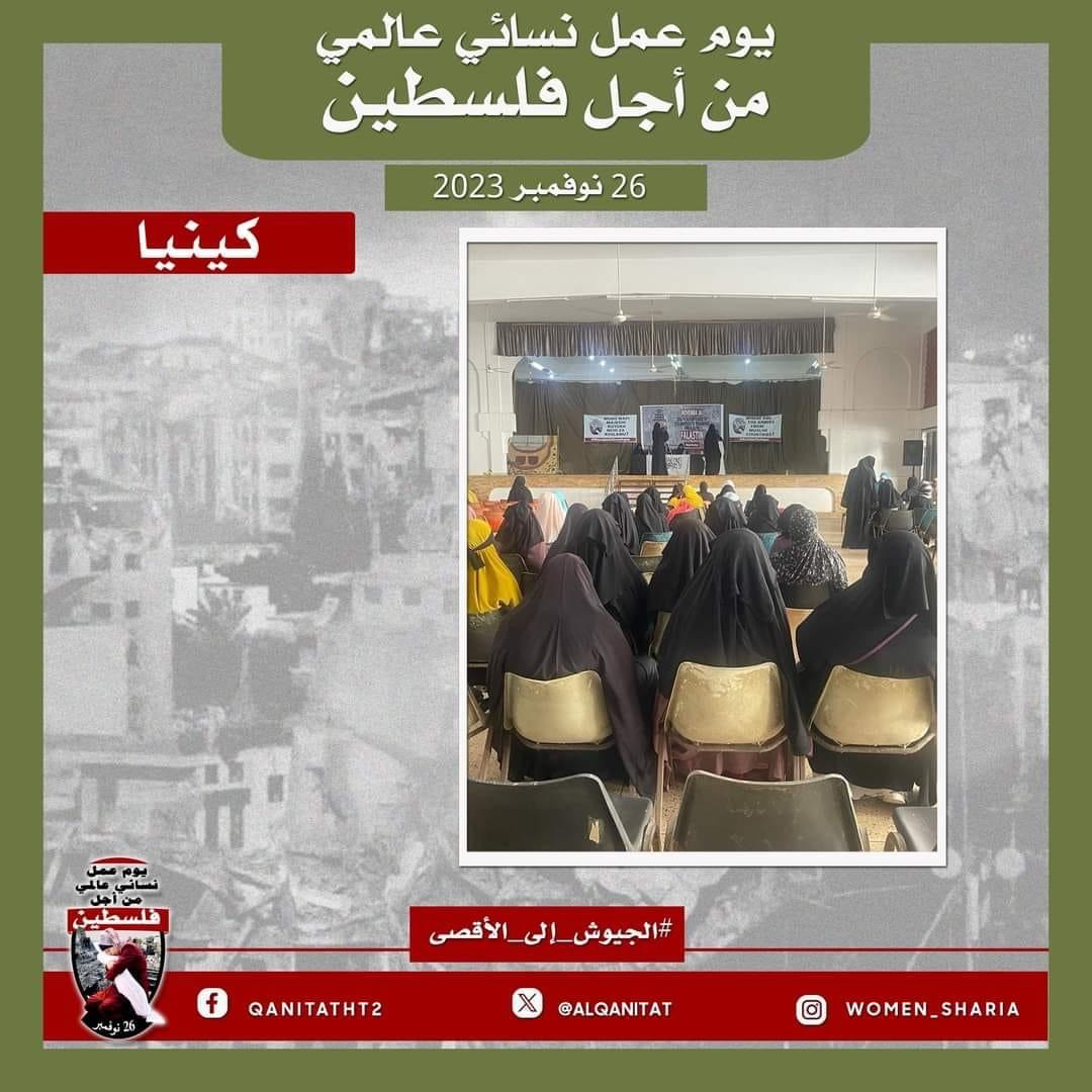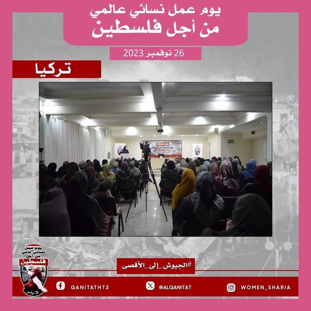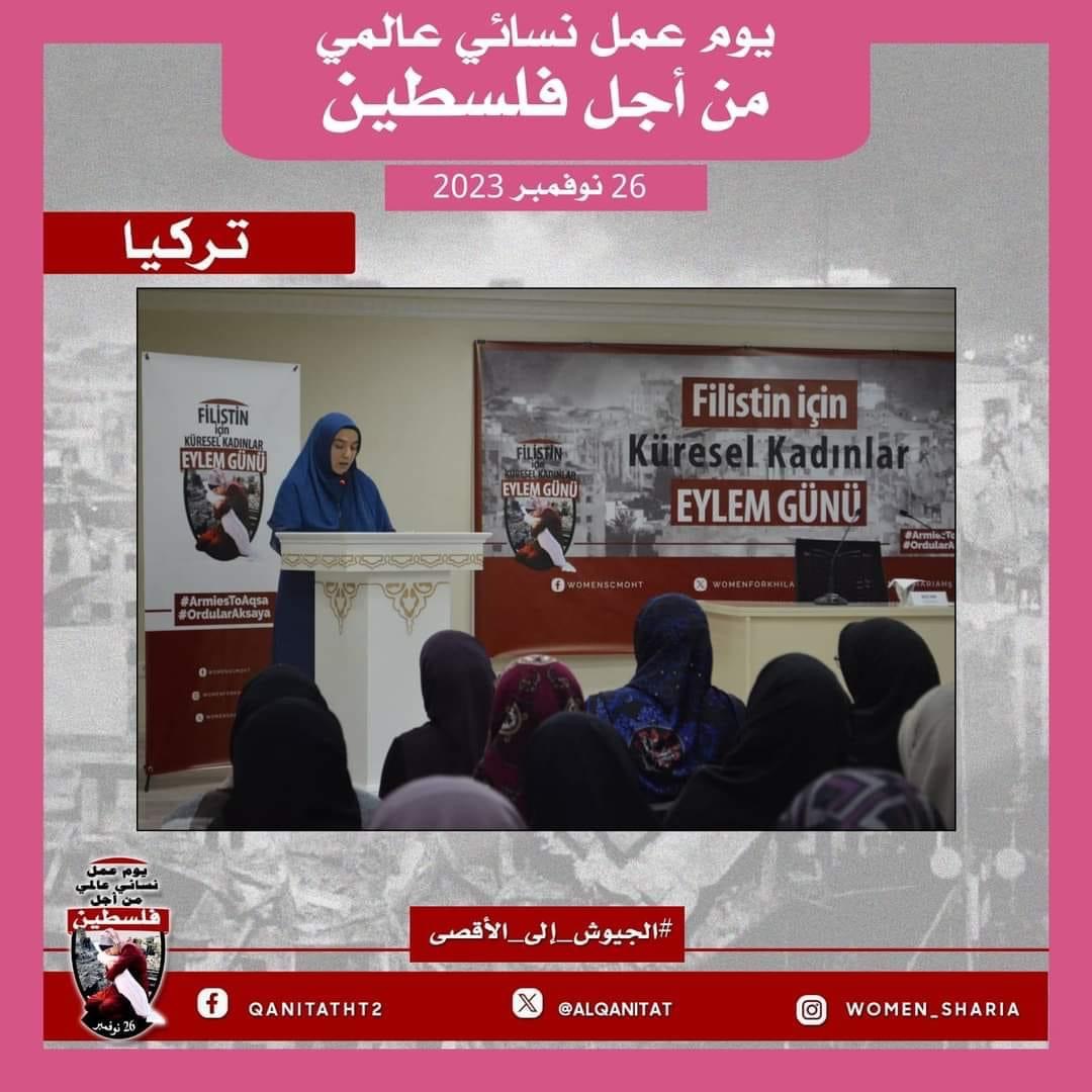 نظم القسم النسائي في المكتب الإعلامي المركزي لحزب التحرير بالتنسيق مع نساء حزب التحرير عالميا "اليوم العالمي للمرأة من أجل فلسطين" للمطالبة بتحرك جيوش بلاد المسلمين بشكل عاجل لإنقاذ نساء وأطفال غزة وتحرير كامل أرض فلسطين المباركة من الاحتلال الصهيوني القاتل. نظمت فعاليات اليوم العالمي في خمس قارات وتضمنت احتجاجات وندوات وأنشطة أخرى قامت بها نساء في فلسطين وتركيا وإندونيسيا وتونس ولبنان وماليزيا وكينيا وأمريكا وأستراليا والدنمارك وهولندا وبلجيكا وبريطانيا.