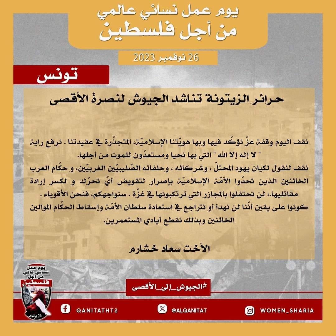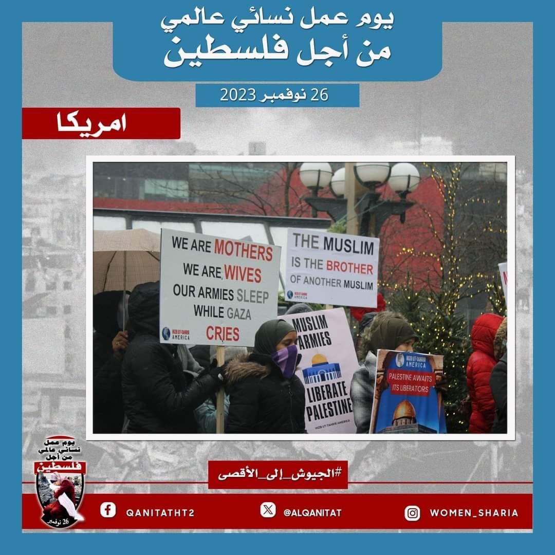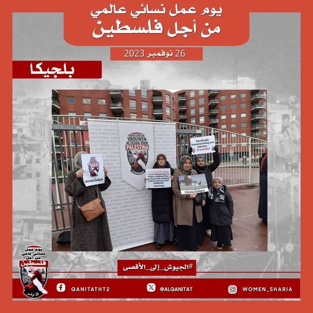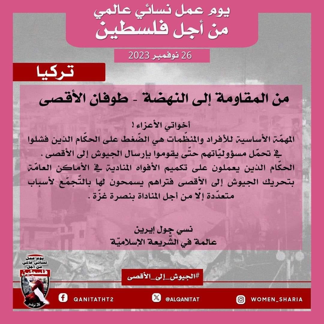 اليوم، تردّدت أصوات النساء المسلمات في جميع أنحاء العالم؛ من البلاد العربية إلى أوروبا، ومن آسيا إلى أفريقيا، ومن أمريكا إلى أستراليا، متحدات في صوت واحد، ودعوة واحدة لإخواننا وآبائنا وأبنائنا في جيوش المسلمين للارتقاء إلى واجبهم الإسلامي المتمثل في كونهم المدافعين عن هذه الأمة وحماتها؛ للارتقاء إلى مستوى التزامهم الإسلامي، ليس فقط بإنقاذ رجال ونساء وأطفال غزة من حمام الدم هذا، أو الدفاع عن مسلمي الضفة الغربية من إرهاب هذا الكيان الصهيوني الإجرامي، بل بتحرير كل شبر من الأرض المباركة بأكملها، تحرير فلسطين من هذا الاحتلال القاتل؛ فهذا ما يريده الله سبحانه وتعالى!