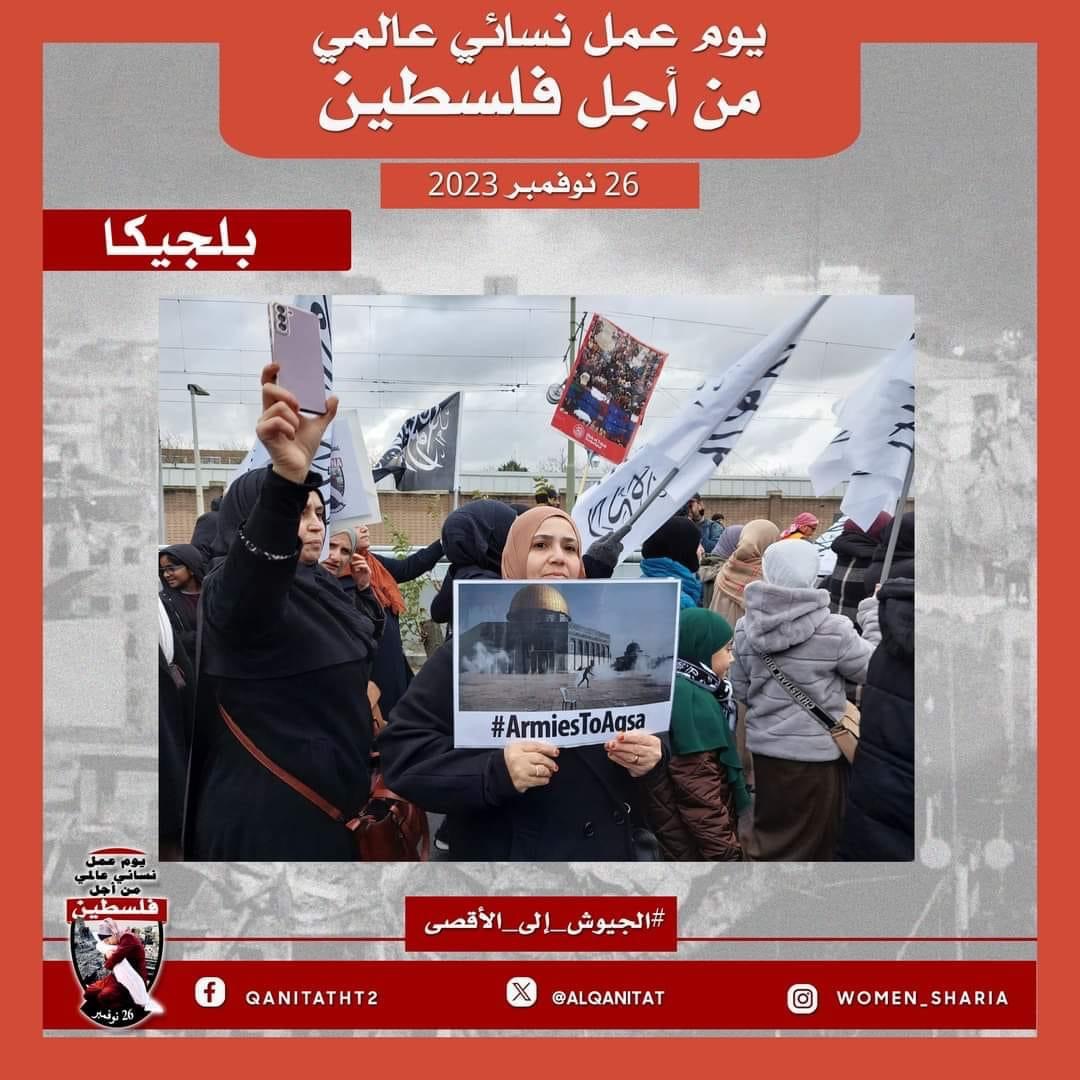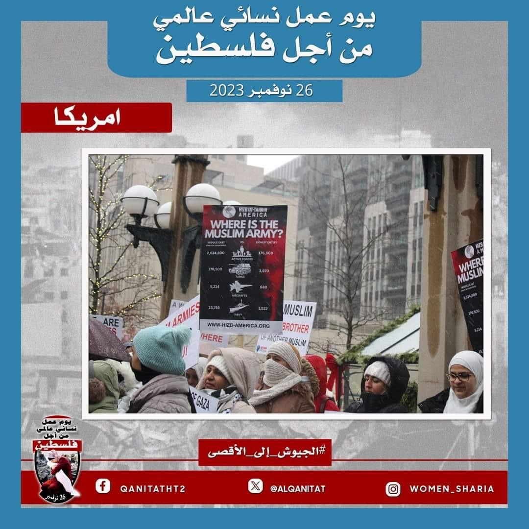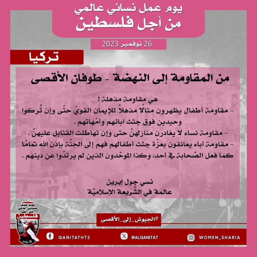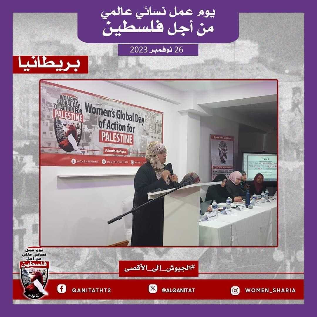 اليوم، تردّدت أصوات النساء المسلمات في جميع أنحاء العالم؛ من البلاد العربية إلى أوروبا، ومن آسيا إلى أفريقيا، ومن أمريكا إلى أستراليا، متحدات في صوت واحد، ودعوة واحدة لإخواننا وآبائنا وأبنائنا في جيوش المسلمين للارتقاء إلى واجبهم الإسلامي المتمثل في كونهم المدافعين عن هذه الأمة وحماتها؛ للارتقاء إلى مستوى التزامهم الإسلامي، ليس فقط بإنقاذ رجال ونساء وأطفال غزة من حمام الدم هذا، أو الدفاع عن مسلمي الضفة الغربية من إرهاب هذا الكيان الصهيوني الإجرامي، بل بتحرير كل شبر من الأرض المباركة بأكملها، تحرير فلسطين من هذا الاحتلال القاتل؛ فهذا ما يريده الله سبحانه وتعالى!