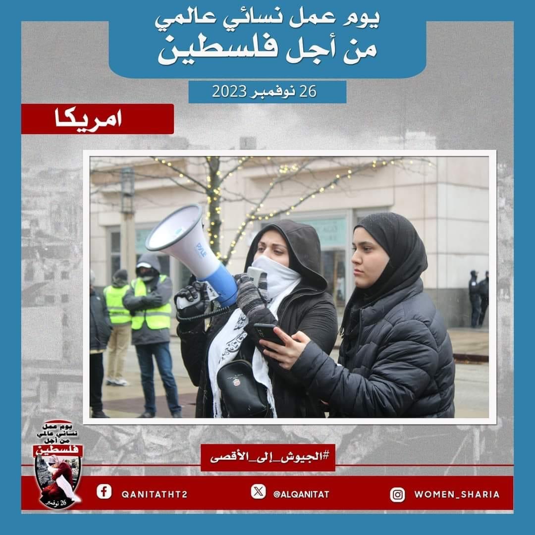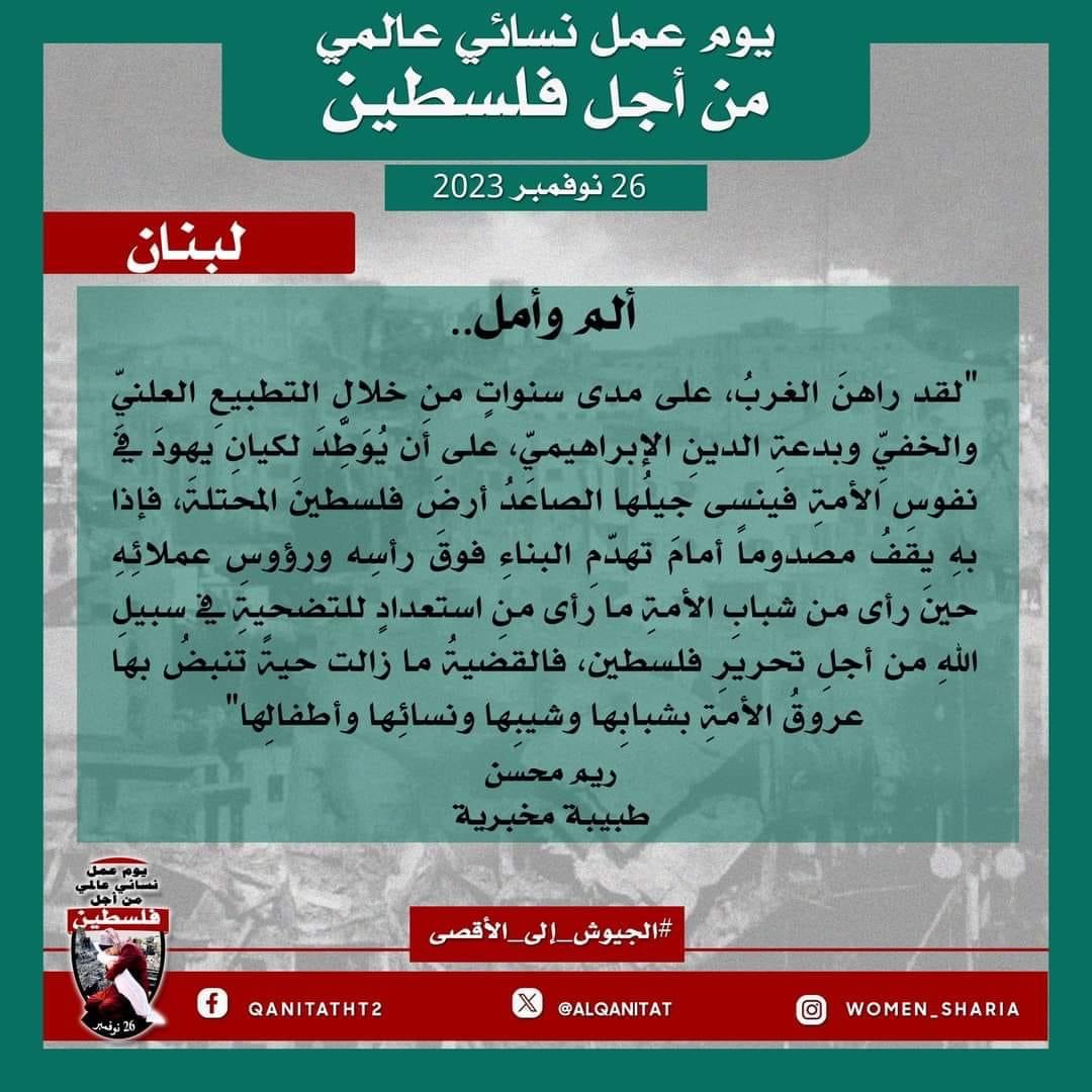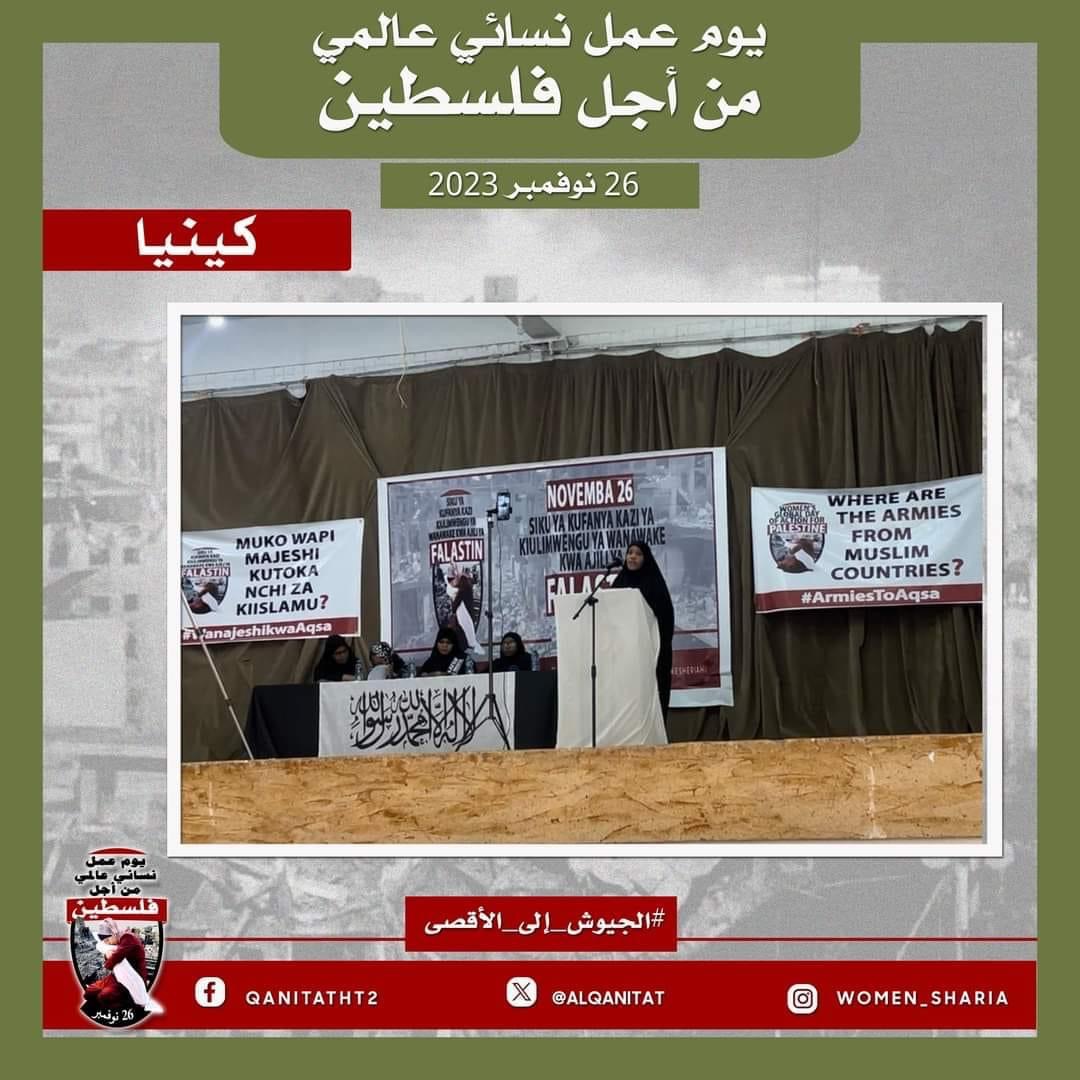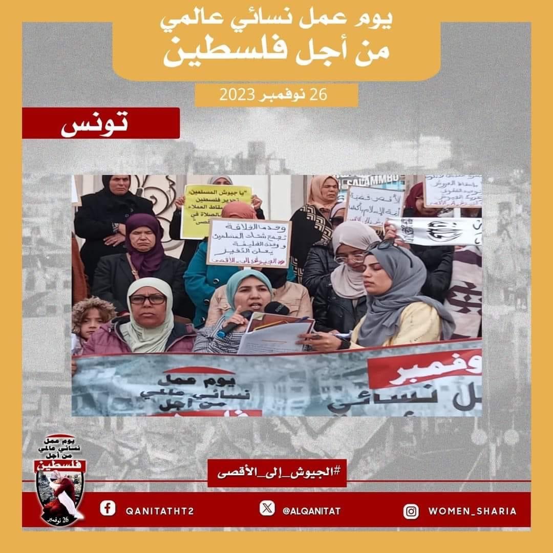 اليوم، تردّدت أصوات النساء المسلمات في جميع أنحاء العالم؛ من البلاد العربية إلى أوروبا، ومن آسيا إلى أفريقيا، ومن أمريكا إلى أستراليا، متحدات في صوت واحد، ودعوة واحدة لإخواننا وآبائنا وأبنائنا في جيوش المسلمين للارتقاء إلى واجبهم الإسلامي المتمثل في كونهم المدافعين عن هذه الأمة وحماتها؛ للارتقاء إلى مستوى التزامهم الإسلامي، ليس فقط بإنقاذ رجال ونساء وأطفال غزة من حمام الدم هذا، أو الدفاع عن مسلمي الضفة الغربية من إرهاب هذا الكيان الصهيوني الإجرامي، بل بتحرير كل شبر من الأرض المباركة بأكملها، تحرير فلسطين من هذا الاحتلال القاتل؛ فهذا ما يريده الله سبحانه وتعالى!