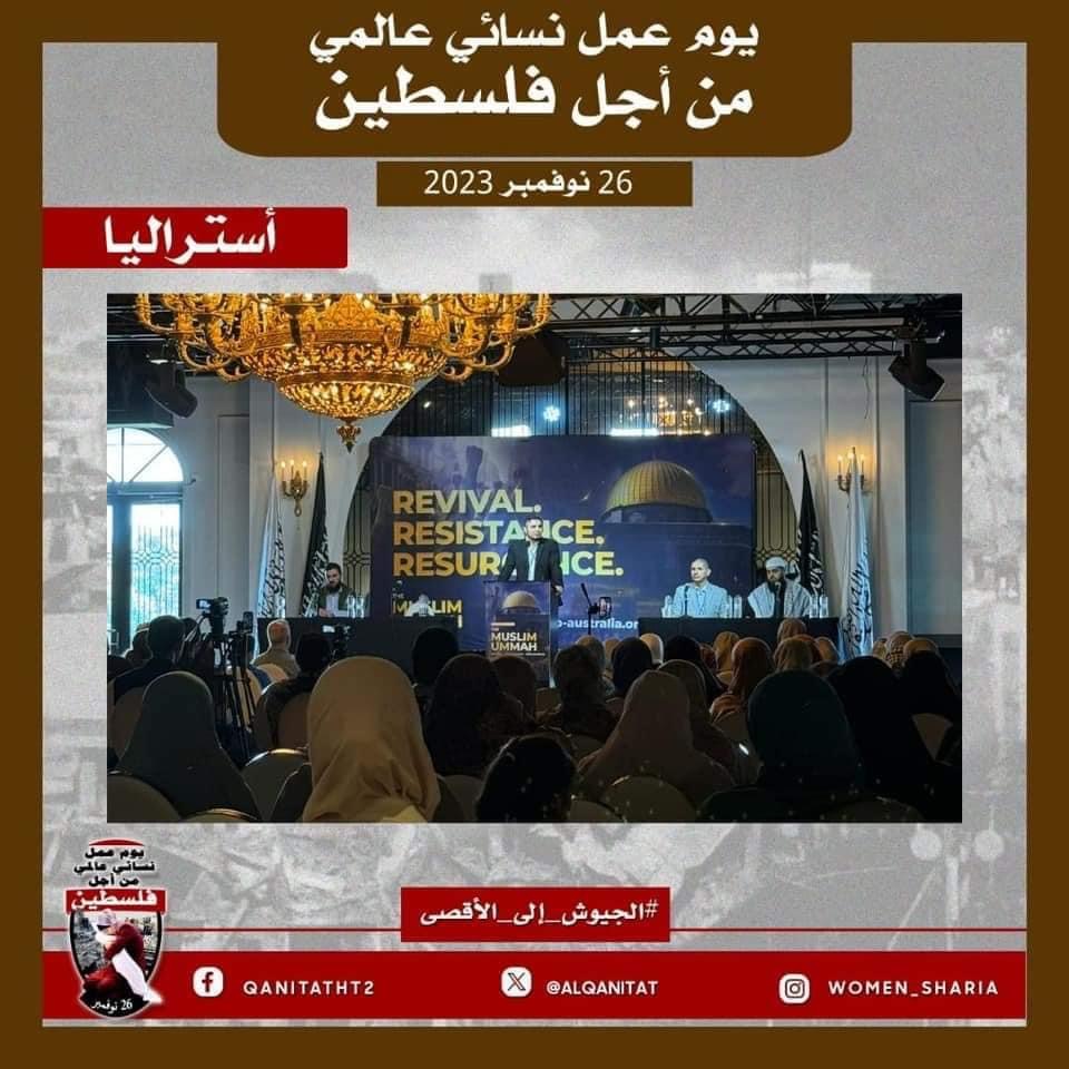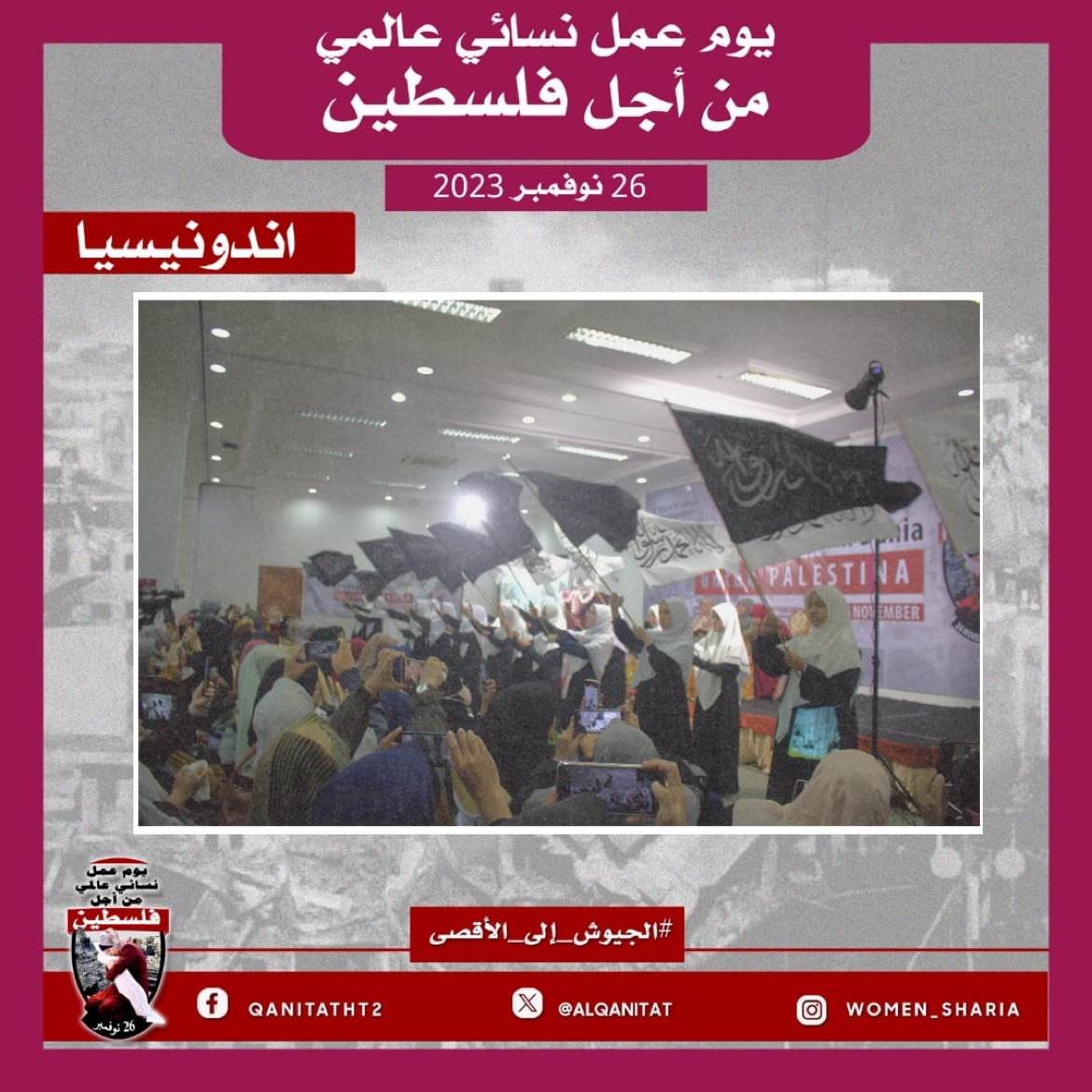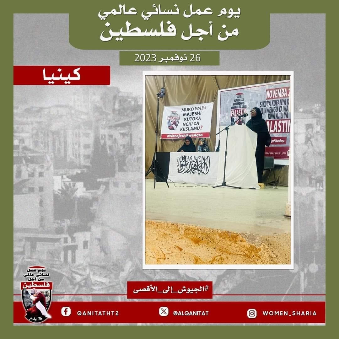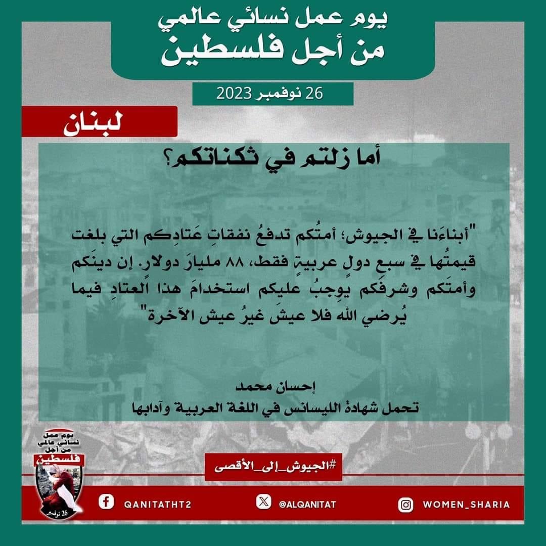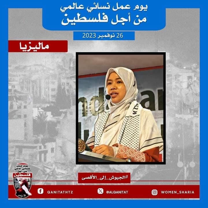 اليوم، تردّدت أصوات النساء المسلمات في جميع أنحاء العالم؛ من البلاد العربية إلى أوروبا، ومن آسيا إلى أفريقيا، ومن أمريكا إلى أستراليا، متحدات في صوت واحد، ودعوة واحدة لإخواننا وآبائنا وأبنائنا في جيوش المسلمين للارتقاء إلى واجبهم الإسلامي المتمثل في كونهم المدافعين عن هذه الأمة وحماتها؛ للارتقاء إلى مستوى التزامهم الإسلامي، ليس فقط بإنقاذ رجال ونساء وأطفال غزة من حمام الدم هذا، أو الدفاع عن مسلمي الضفة الغربية من إرهاب هذا الكيان الصهيوني الإجرامي، بل بتحرير كل شبر من الأرض المباركة بأكملها، تحرير فلسطين من هذا الاحتلال القاتل؛ فهذا ما يريده الله سبحانه وتعالى!
