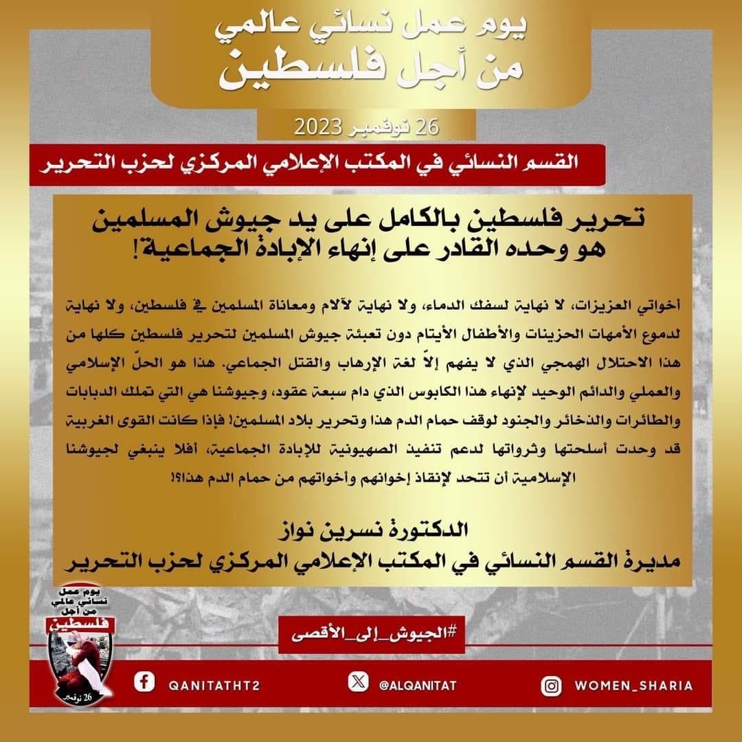 ردّاً على هذه الإبادة الجماعية والنكبة في القرن الحادي والعشرين، أطلق القسم النسائي في المكتب الإعلامي المركزي لحزب التحرير، بالتنسيق مع نساء حزب التحرير حول العالم، حملة عالمية مكثفة ستسبق "يوم عمل نسائي عالمي من أجل فلسطين" بتاريخ 26 تشرين الثاني/نوفمبر 2023م لمطالبة جيوش المسلمين بالتحرك بشكل عاجل لإنقاذ نساء غزة وأطفالها وتحرير كامل الأرض المباركة (فلسطين) من هذا الاحتلال السرطاني، وإعطاء النصرة لحزب التحرير لإقامة الخلافة على منهاج النبوة التي ستجيش الجيوش للذود عن المسلمين المستضعفين في جميع أنحاء العالم.