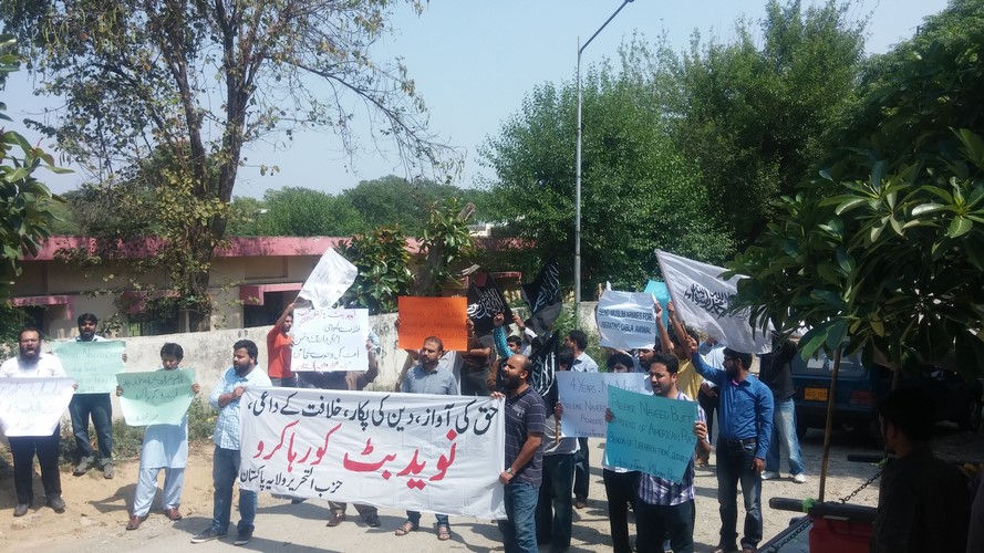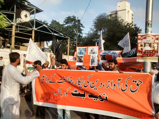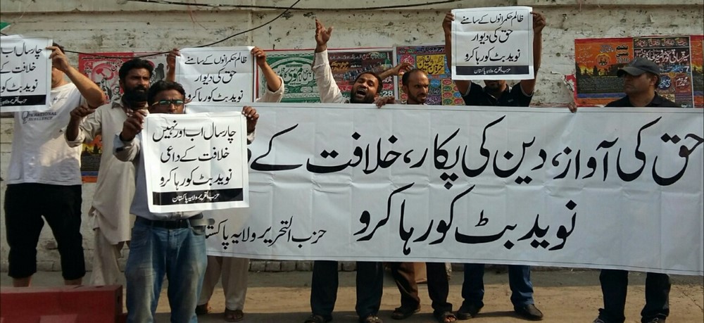 حزب التحرير / ولاية باكستان يتظاهر في مختلف مدن البلاد بمناسبة الذكرى الرابعة لاختطاف نفيد بوت (الناطق الرسمي لحزب التحرير في ولاية باكستان)، على أيدي أجهزة المخابرات، وقد حمل المتظاهرون لافتات كتب عليها: "أطلقوا سراح نفيد بوت، صوت الحقيقة، حامل دعوة الخلافة" و"أطلقوا سراح نفيد بوت، قائد قول كلمة الحق في وجوه الحكام الطغاة".