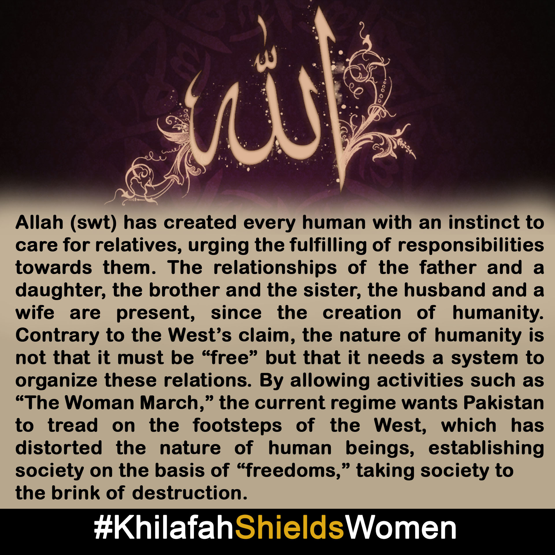 Hizb ut Tahrir / Wilayah Pakistan undertook an active social media campaign entitled "#KhilafahShieldsWomen." It was in response to the regime's active promotion of a "Woman March," to be held on 8 March, with the vulgar slogan of "My body, My choice." The campaign was warmly received by the Islam - loving people of Pakistan, who are aware of the ills of Western culture regarding family values.
