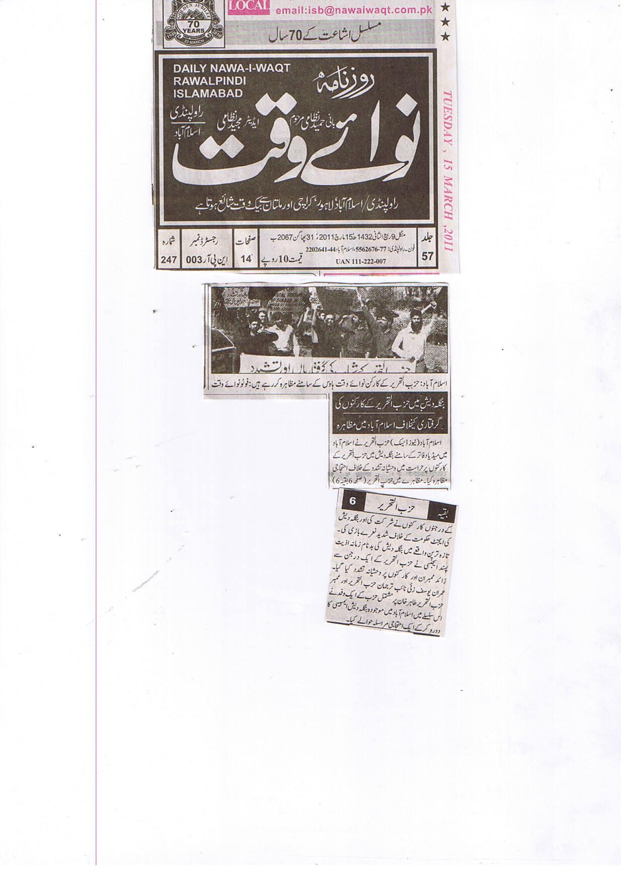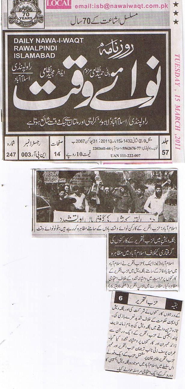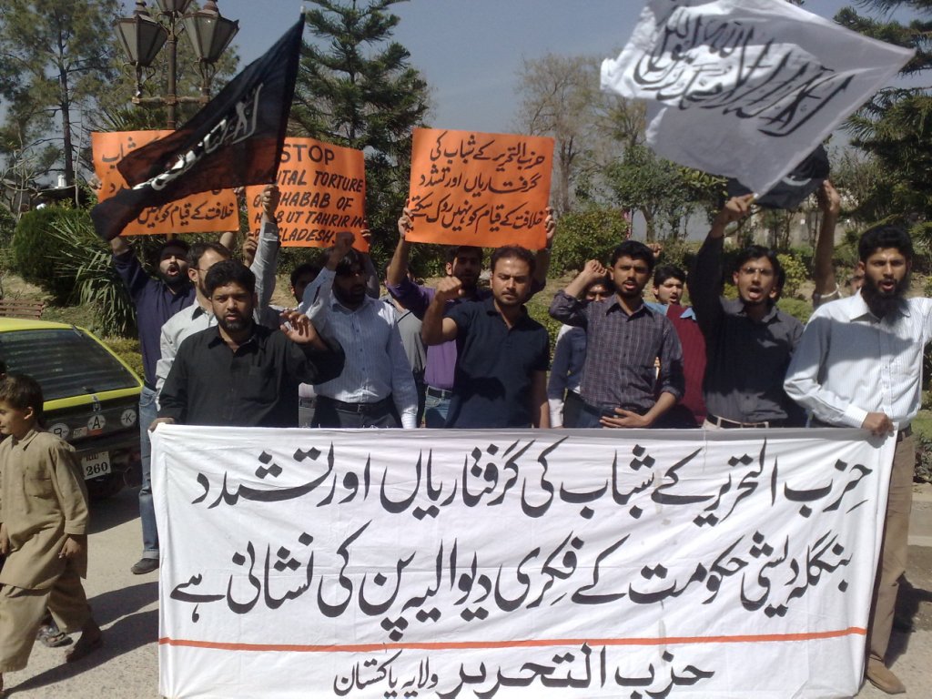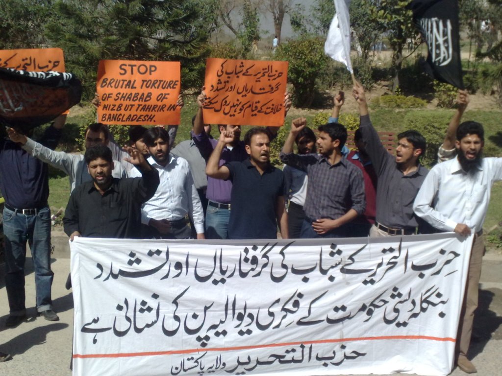 Hizb ut-Tahrir Wilayah Pakistan held a demonstration in the capital over the brutal torture against the members of Hizb ut-Tahrir in Bangladesh, on Monday 14 March. The main banner read, "The brutal torture and arrests of Hizb ut-Tahrir shows that the Bangladeshi regime is bereft of intellectual justification for its stance." Hizb ut-Tahrir maintains that there must be no borders between the Muslim Lands, that these borders are the manufacture of colonialists powers and once Khilafah "Caliphate" is established, the Muslim Lands of Pakistan and Bangladesh will be unified and that day is not far inshaAllah.