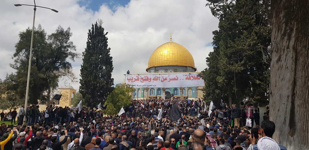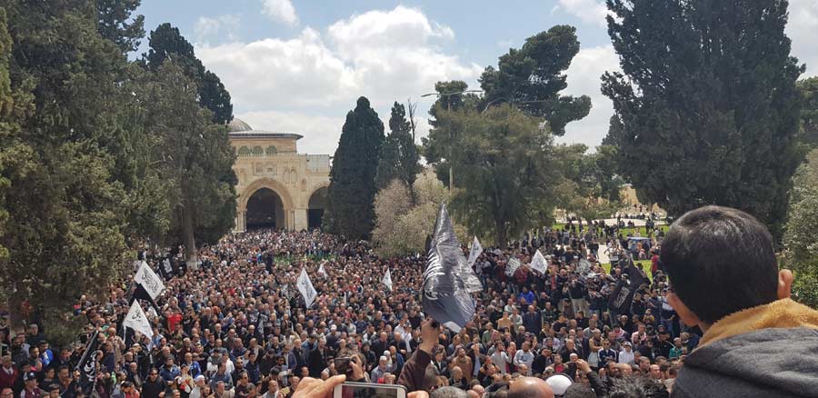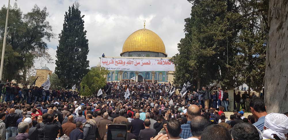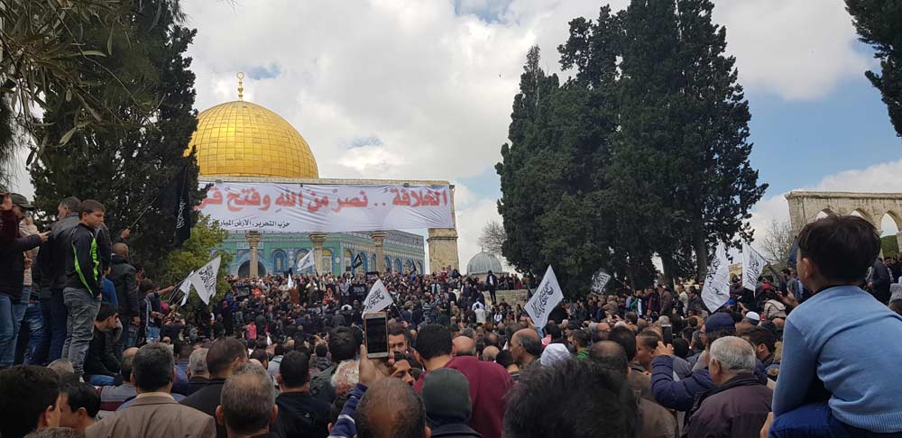 In the presence of thousands and amid the chants for the Khilafah (Caliphate) and the raising of black banners and white flags, Hizb ut Tahrir in the Blessed Land - Palestine from the courtyards of Al-Aqsa Mosque after Friday prayers, 29 Rajab Muharram 1440 AH corresponding to 5 April 2019 CE appealed to the Ummah and its armies for urgent action to liberate Palestine and cleanse the Al-Aqsa Mosque and the establishment of the Khilafah (Caliphate).