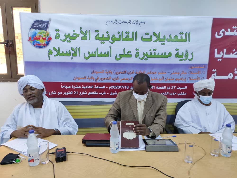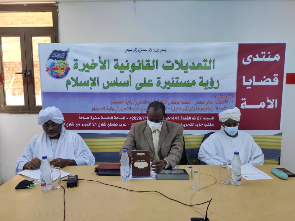 The main speakers included Ustaadh Hatem Ja’far Ibrahim (lawyer) - Member of the Wilayah Council of Hizb ut Tahrir / Wilayah Sudan, and Ustaadh Ibrahim Othman (Abu Khalil) - Official Spokesman of Hizb ut Tahrir in Wilayah of Sudan, who spoke of the Transitional Government's abolition for a number of laws on the pretext that they restrict freedoms, and said: By looking at the Official Gazette No. 1904 issued on Monday 7/13/2020, we find that the amendments to the laws (35 amendments to the criminal law, and 3 amendments to the criminal procedure law, One article in the Parties Law, 5 articles in the National Security Law, one in the Traffic Law, 3 articles in the Passports and Immigration Law, two articles in the Public Prosecution Law, and 34 articles in the Law on Information Crime Prevention, a new law called the Law of the Commission for the Reform of the Legal and Justice System of 2020).