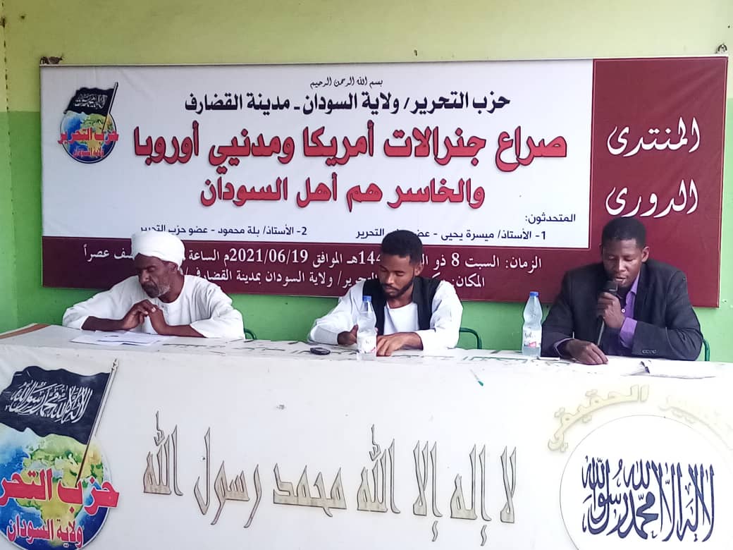 In another direction, steadfastness on the principle and sincerity in the march and sensing the great responsibility, Hizb ut Tahrir / Wilayah Sudan held its monthly forum in Gedaref on Friday, June 19, 2021 at the party’s office in Gedaref, which was titled: “The struggle of American generals and the civilians of Europe and the loss of the people of Sudan.” The first paper was presented by Maysara Yahya Muhammad Nour, in which he recounted the reality of the European-American conflict over the country embodied in the parties to the government, each according to his employment.