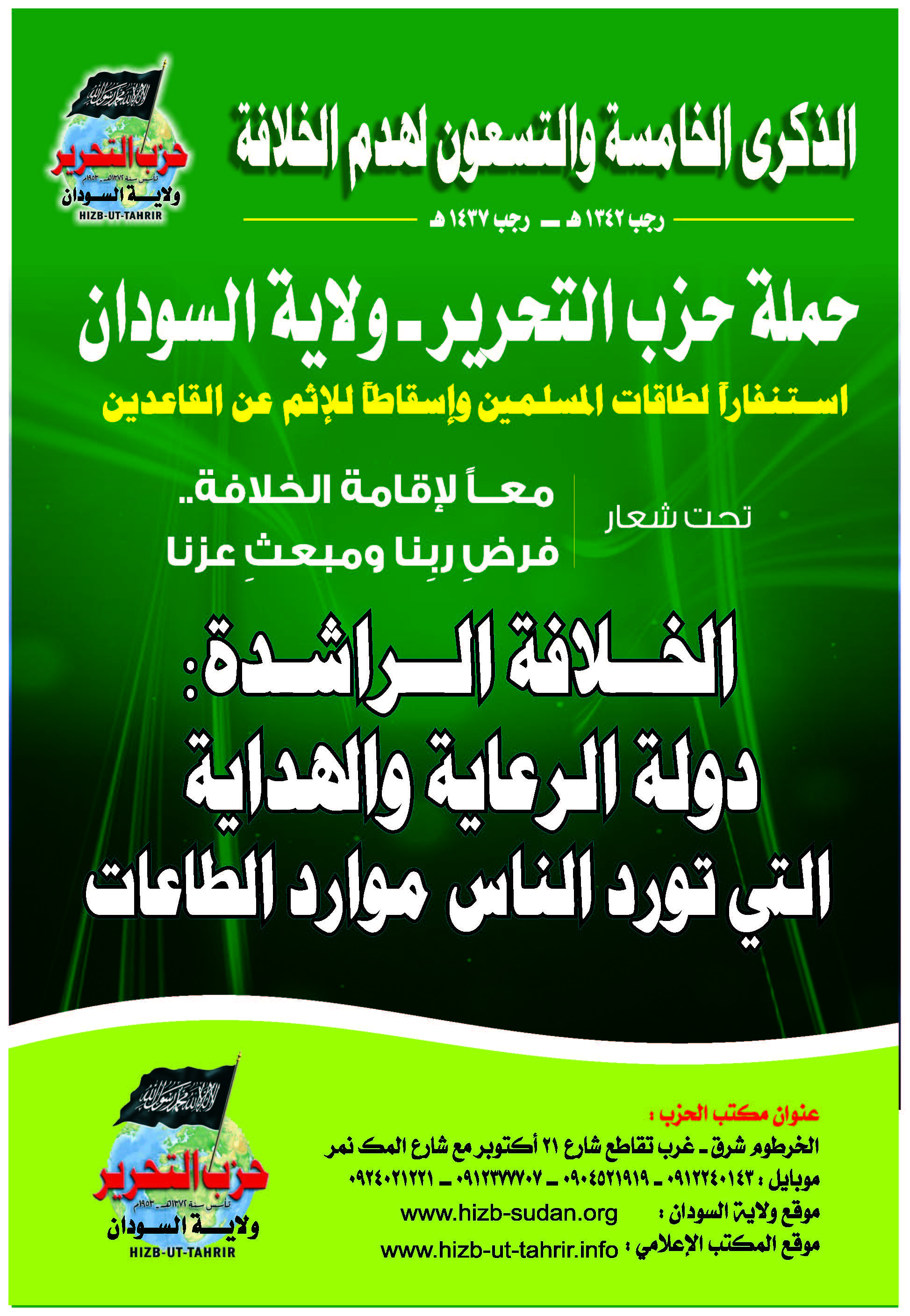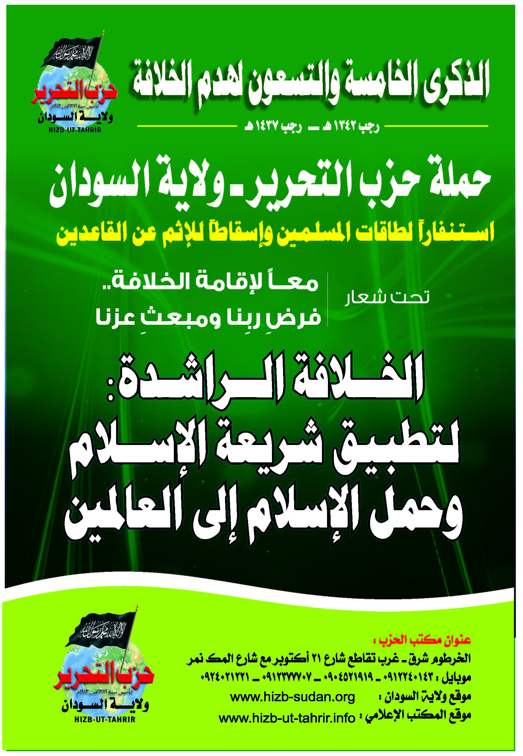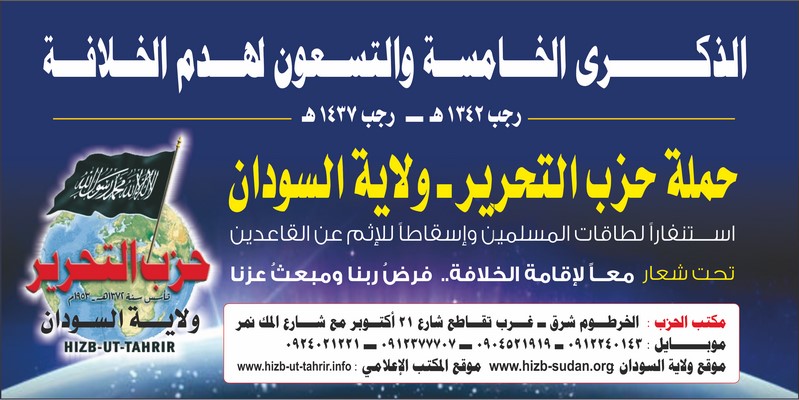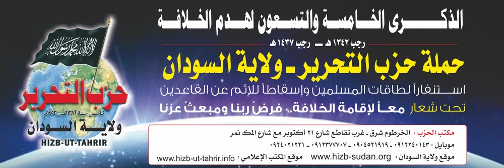 To revive the vital issue of the Ummah; namely, transforming the country into a land of Islam, and unifying it with other Muslim countries under the shade of the righteous Khilafah "Caliphate" (Caliphate) on the method of Prophethood, Hizb ut Tahrir Wilayah of Sudan will launch a campaign on the occasion of the 95th anniversary of the destruction of the Khilafah "Caliphate", throughout the month of Rajab, starting on Friday, the 1st of Rajab 1437 AH corresponding to the 8th of April 2016 CE, to mobilize the energies – capacities of Muslims to work to resume the Islamic way of life, and to remove the sin from those who neglected this duty, under the slogan: “United for the establishment of the Khilafah "Caliphate" ... The Obligation of our Lord and Source of our Dignity”.