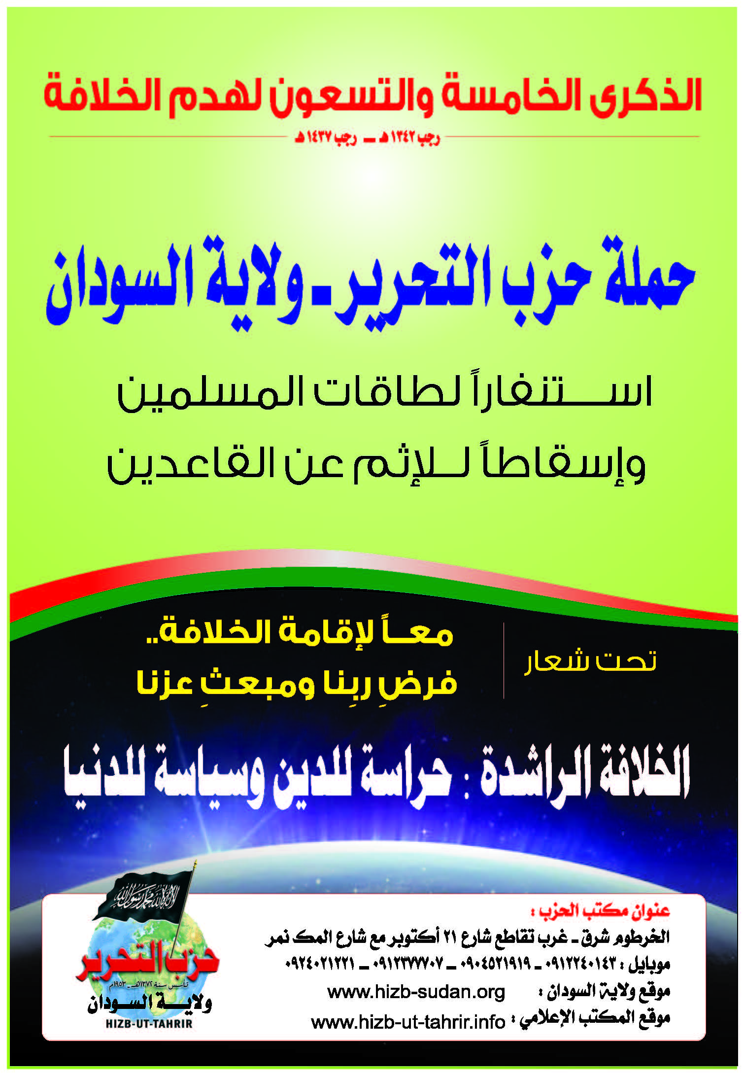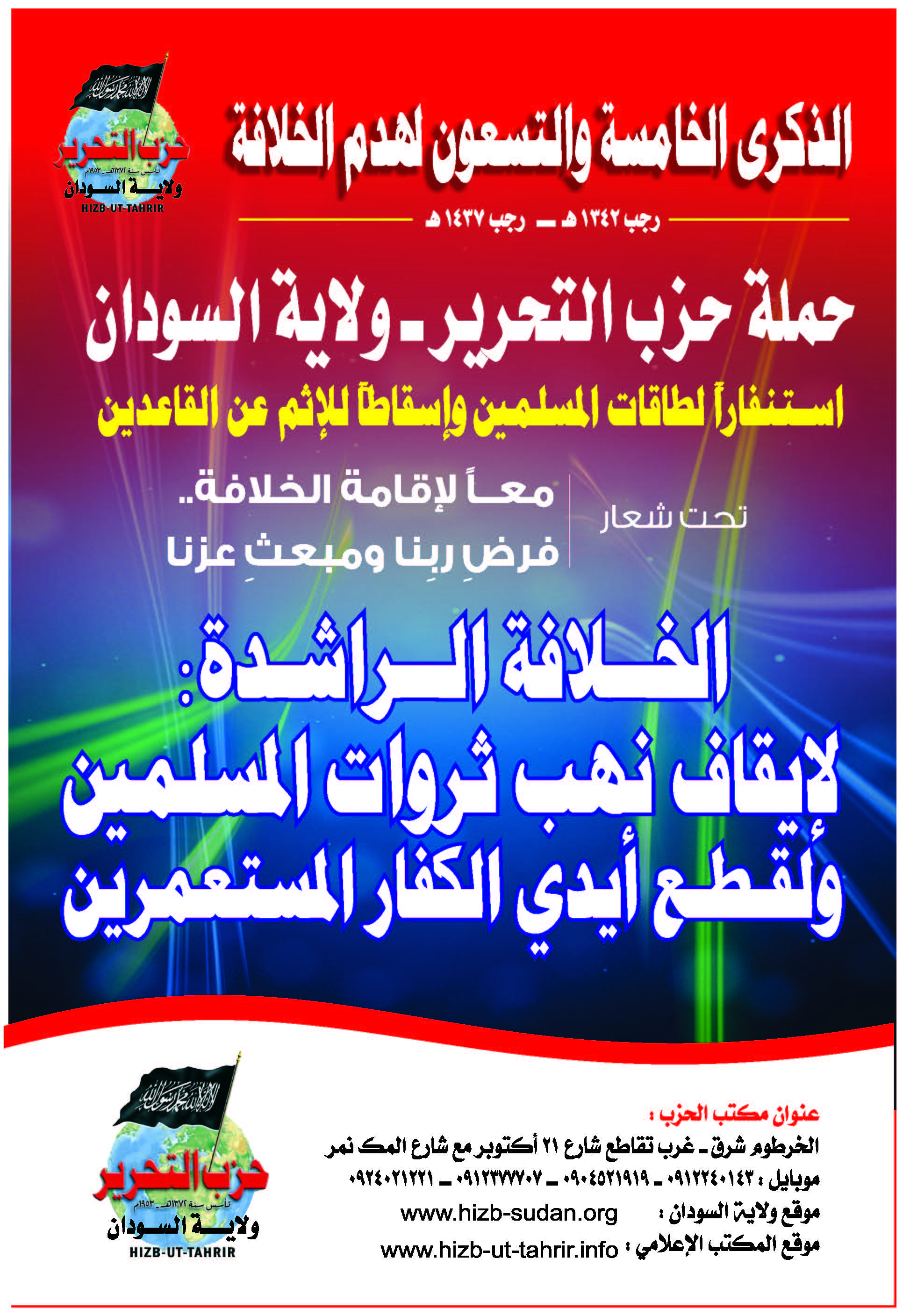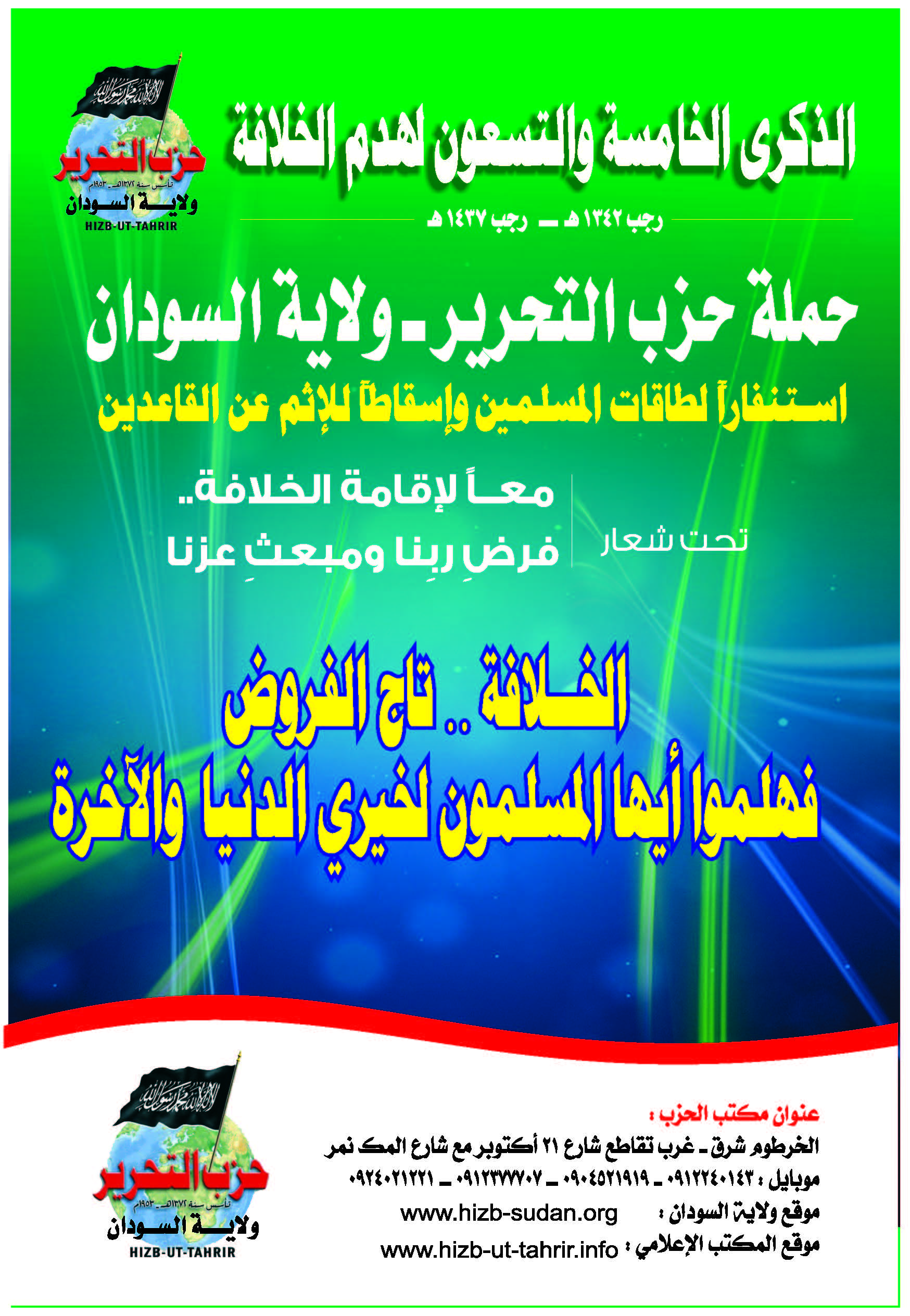 To revive the vital issue of the Ummah; namely, transforming the country into a land of Islam, and unifying it with other Muslim countries under the shade of the righteous Khilafah "Caliphate" (Caliphate) on the method of Prophethood, Hizb ut Tahrir Wilayah of Sudan will launch a campaign on the occasion of the 95th anniversary of the destruction of the Khilafah "Caliphate", throughout the month of Rajab, starting on Friday, the 1st of Rajab 1437 AH corresponding to the 8th of April 2016 CE, to mobilize the energies – capacities of Muslims to work to resume the Islamic way of life, and to remove the sin from those who neglected this duty, under the slogan: “United for the establishment of the Khilafah "Caliphate" ... The Obligation of our Lord and Source of our Dignity”.