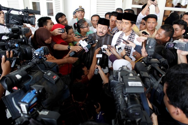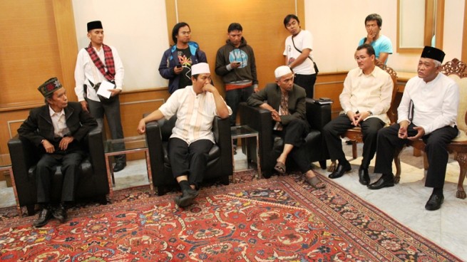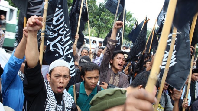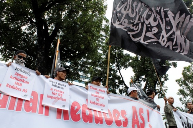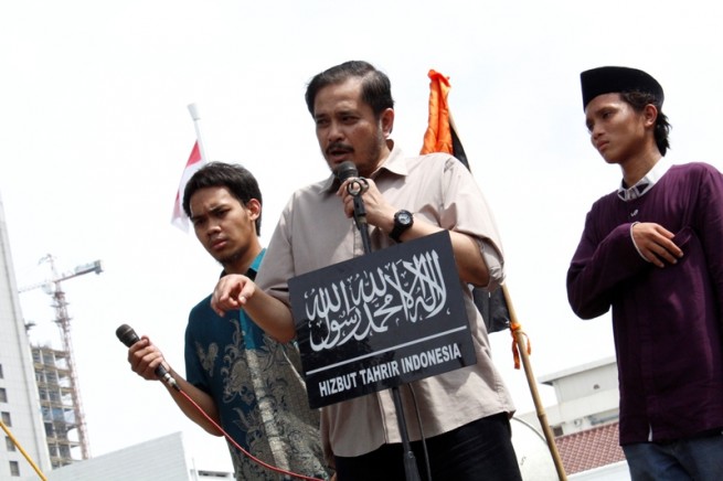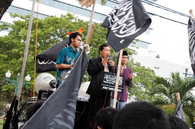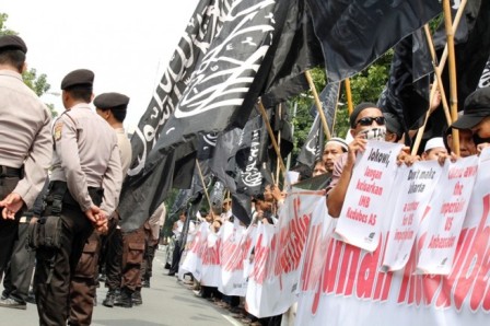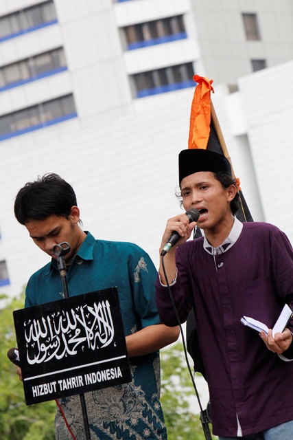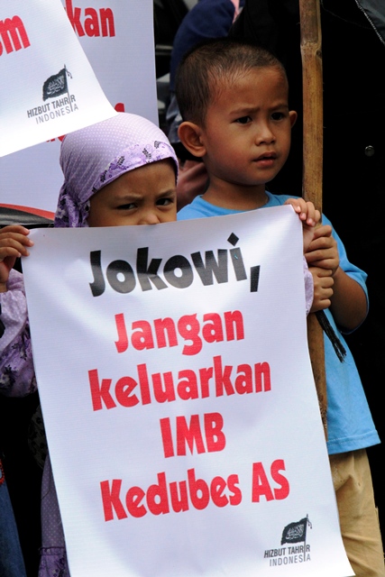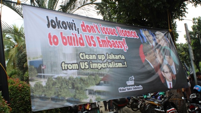 1500 members of Hizb ut Tahrir / Indonesia demonstrated on Friday, 12 Rabii II 1434 AH, corresponding to 22 February 2013 in front of the Jakarta governor's office, demanding the governor (Jokowi) not to allow the plan to renew and expand the U.S. embassy in Jakarta. A delegation of Hizb ut Tahrir met with the governor to discuss the issue with him. The activity was attended by representatives from other Islamic groups; Muhammadiyah, Ansar al-Tawhid, Mir - Cee, Indonesia's Muslim Brotherhood, stressing that the goal of expansion of the U.S. embassy is to strengthen U.S. influence in colonial Indonesia.