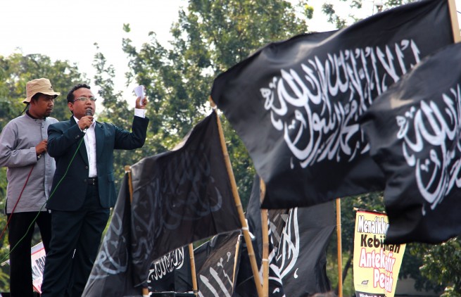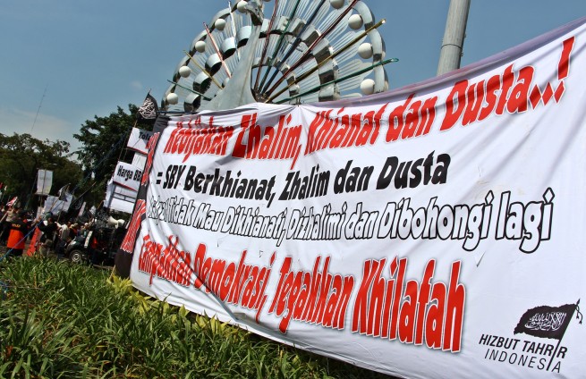Hizb ut Tahrir / Indonesia organized the protest before the presidential palace in Jakarta to protest the rise of fuel prices titled: