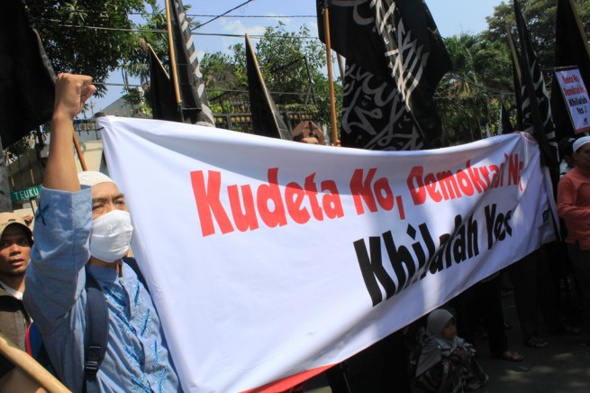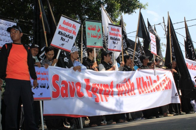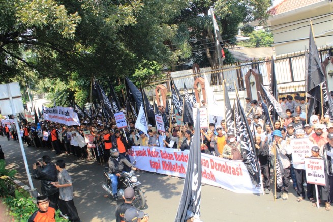 Hizb ut Tahrir/ Indonesia organized protests throughout many cities of Indonesia the most noted the Jakarta protest before the Egyptian Embassy then moving forward to the tyrant Bashar's Embassy denouncing the brutal massacres that occurred in Egypt and Syria, which is the latest chemical massacre in the countryside of Damascus.
