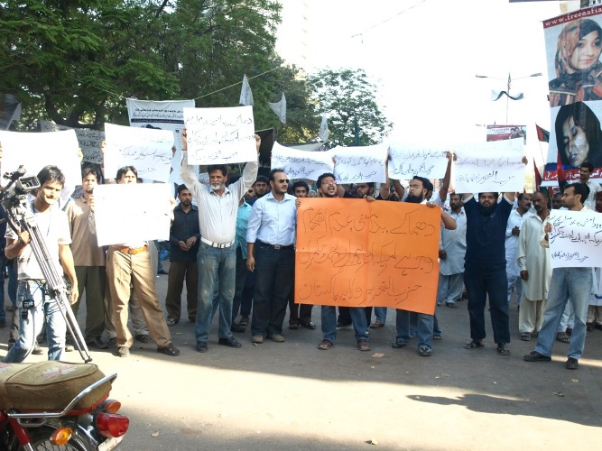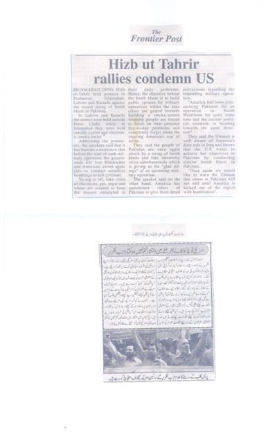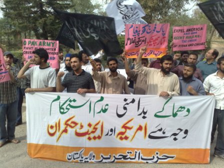 Hizb ut-Tahrir held protests in Peshawar, Islamabad, Lahore and Karachi against the recent string of bomb blasts in Pakistan. In Lahore and Karachi the demos were held outside Press Clubs while in Islamabad they were held outside a print and electronic media outlet. Addressing the protesters, the speakers said that it has become a norm now that before the start of each military operation the government lets lose Blackwater and American secret agencies to conduct senseless bombings to kill civilians. To top it off, fake crisis of electricity, gas, sugar and wheat are created to keep the masses entangled in their daily problems. Hence, the objective behind the bomb blasts is to build public opinion for military operations whilst the fake crises are geared towards building a smoke-screen whereby people are forced to focus on their personal day-to-day problems and completely forget about the ongoing America's war of terror. The people of Pakistan are once again struck by a string of bomb blasts and fake electricity crisis simultaneously which is giving us the "glad tidings" of an upcoming military operation. On the other hand, America has summoned rulers of Pakistan to give them detail instructions regarding the impending military operation. America had been pressurizing Pakistan for an operation in North Waziristan for quite some time and the current political situation is heading towards the same direction. The Ummah is well aware of America's dirty role in Iraq and knows that the US wants to achieve her objectives in Pakistan by conducting similar bomb blasts in Pakistan. Once again we would like to warn the Ummah that chaos in Pakistan will not end until America is kicked out of the region with humiliation. We ask the sincere people in the Pakistani Army that for how long will you continue to be a silent spectator? The US war against Pakistan and its Muslims is continuing. Is it not your responsibility to come forward and protect Islam and Muslims? We demand from the sincere elements within the Pakistani military that they provide Nusrah (material support) to Hizb ut-Tahrir to implement Islam and eject US from the region; so that the Muslims may regain their lost might and respect which they duly deserve.