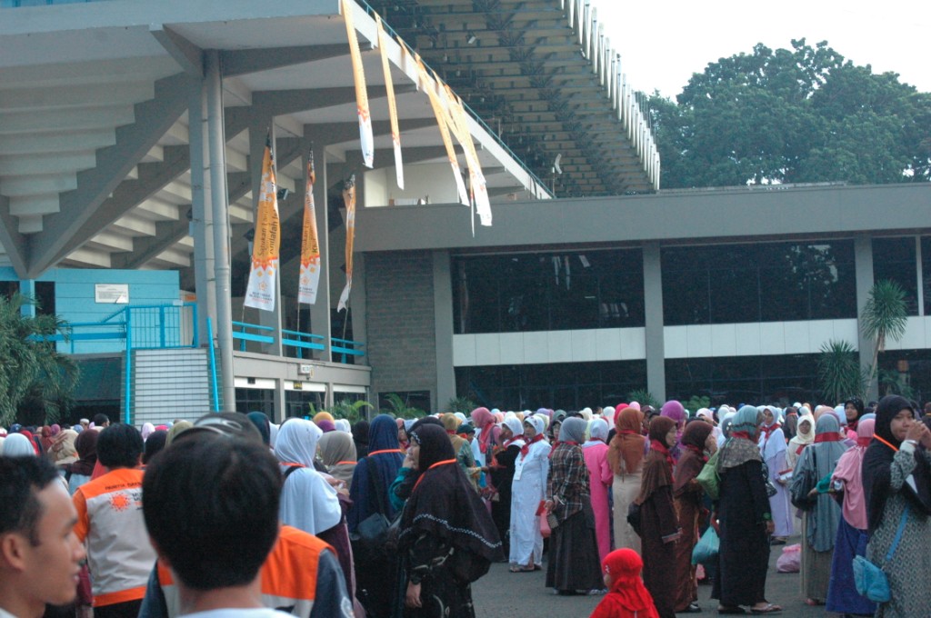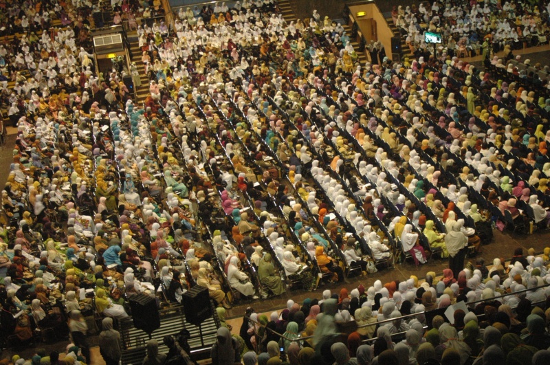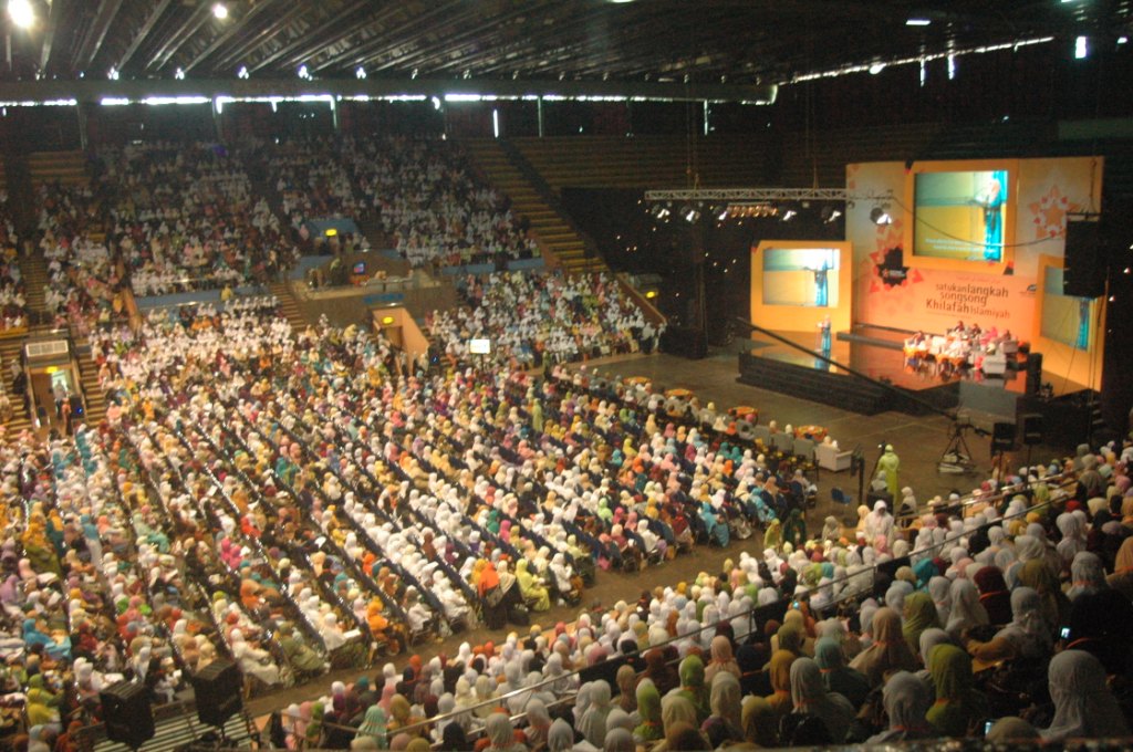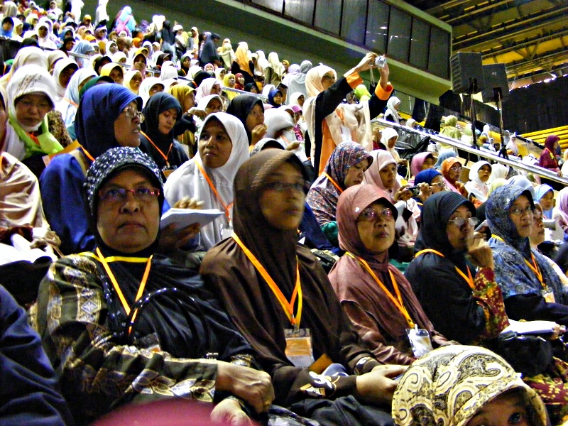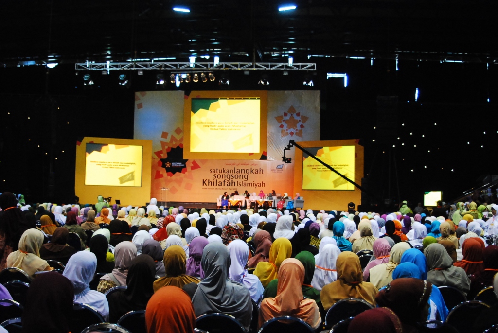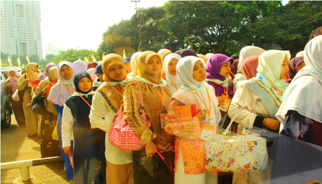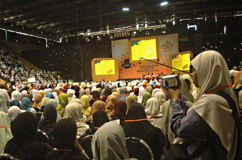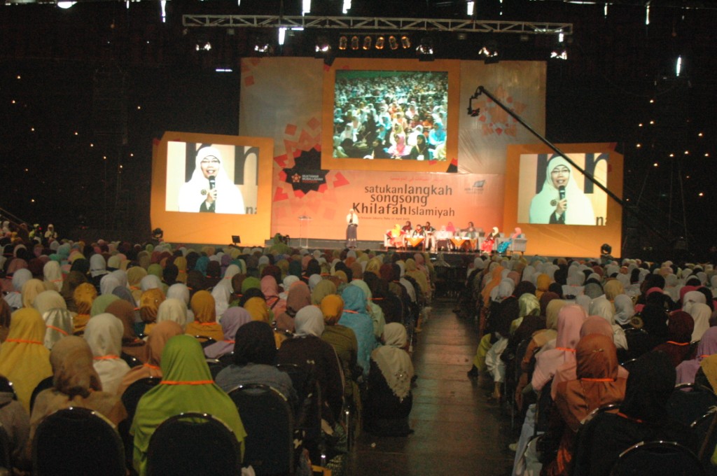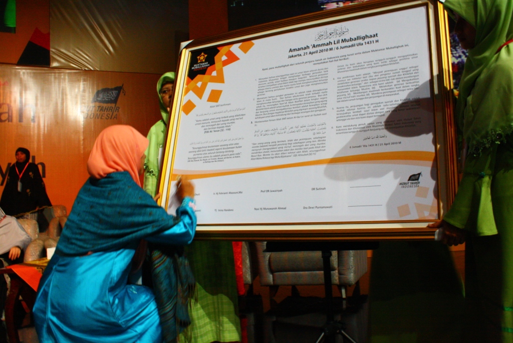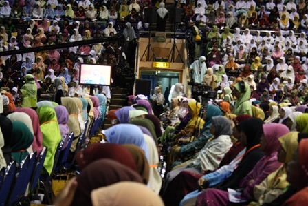 On Wednesday 23rd April 2010, Moslem women of Hizb ut-Tahrir Indonesia held a National Conference for Mubaligah (Islamic Propagandist) in sport stadium Gelora Bung Karno Jakarta. This conference was attended by not less than 6000 participants came from allover of Indonesia from Aceh to Papua province. This agenda is one of activities of Moslem women of Hizb ut-Tahrir in Indonesia to unite the steps and strengthen the role of Moslem women especially muballigah in supporting the struggle for establishing sharia and khilafah. As to know that Hizb ut-Tahrir Indonesia also in 2007 already succeed to organize 7000 olama (Islamic Scholar) at the same place to support their struggle. In these both conferences all ulama (male and female) signed the letter of agreement to support hizb ut-Tahrir and its struggle, be in the first line of the struggle and protect all its activists. Up to now thousands of ulama participate actively with Hizb ut-Tahrir Indonesia , one of the examples, Hizb ut-Tahrir Indonesia together with thousands of Olama in Majlis al Buhuts Al Islamiyah after signing the letter of agreement succeed to reject the Obama's visit to Indonesia on last March 2010. As known, there is collective awareness happen in the society not only in Indonesia but also in the world that they believe in that there is no any solution to overcome all crisis except with the implementation of Islamic ideology. Those all give optimism to all Muslims that Allah's help will come soon, Islamic life will come true, the khilafah will soon come to liberate world from capitalism domination, and Muslims will live safely at peace with the responsible and just Islamic khilafah.