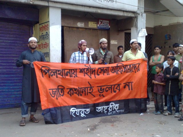 Hizb ut-Tahrir organized public speeches and distributed fliers outside various mosques across Dhaka, Chittagong and Sylhet after Jummah prayers today in remembrance of the army officers who were killed two years ago on this day, (25th of February 2009), at the Pilkhana BDR head quarters. Members of the party who delivered the speeches reminded the Muslims that Sheikh Hasina begun her tenure in government by collaborating with India in the premeditated killing of the brave army officers in order to weaken the BDR and the Muslim Army of Bangladesh. Not being satisfied with this, Sheikh Mirzafor Hasina has been implementing policies for the past two years establishing the control of imperialist disbeliever-polytheist states, US-Britain-India, over the army and defence forces of Bangladesh. The speakers called upon the Muslims to join with Hizb ut-Tahrir in the political struggle to remove the treacherous Hasina government and re-establish the Khilafah "Caliphate" state. The Khilafah "Caliphate" will unite the Muslim Ummah under one state and one flag, build one strong unified Muslim Army, and forever end the domination and occupation of the Ummah by the imperialist disbeliever-polytheist states, US-Britain-India.