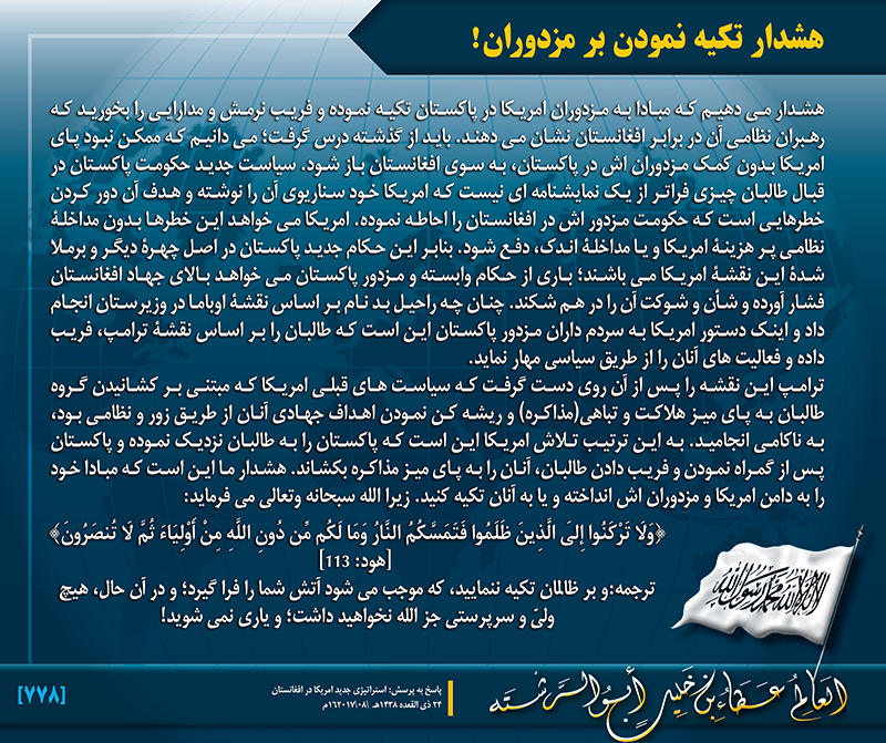 1 محرم 1360 مطابق شنبه, 28 اکتبر 2017م بسم الله الرحمن الرحيم هشدار تکیه نمودن بر مزدوران! مطالب مرتبط: « فعالسازی نقش پاکستان در افغانستان! ای مسلمانان در سراسر جهان: » ابراز نظر نمایید اسم * ایمیل * آدرس انترنتی دو کلمه زیر را وارد نمایید! پیام * پیام تان... back to top