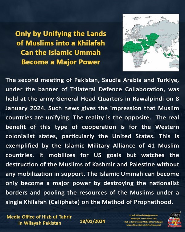 Mkutano wa pili wa Pakistan, Saudia Arabia na Uturuki, chini ya bendera ya Ushirikiano wa Ulinzi wa Nchi Tatu, ulifanyika katika Makao Makuu ya Jeshi huko Rawalpindi mnamo tarehe 8 Januari 2024. Habari kama hizo zinatoa hisia kwamba nchi za Kiislamu zinaungana. Uhalisia ni kinyume chake. Manufaa halisi ya aina hii ya ushirikiano ni kwa dola za kikoloni za Magharibi, haswa Marekani. Hii inadhihirishwa na Muungano wa Kijeshi wa Kiislamu wa nchi 41 za Kiislamu. Unahamasisha malengo ya Marekani lakini unatazama uharibifu wa Waislamu wa Kashmir na Palestina bila kutaharaki kwa aina yoyote kwa ajili ya nusra. Umma wa Kiislamu unaweza tu kuwa nguvu kuu pekee kupitia kuangamiza mipaka ya kitaifa na kuunganisha rasilimali za Waislamu chini ya Khilafah moja kwa Njia ya Utume.