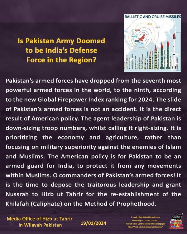 Vikosi vya jeshi la Pakistan vimeshuka kutoka kuwa ni jeshi la saba lenye nguvu zaidi duniani, hadi nafasi ya tisa, kwa mujibu wa orodha mpya ya Global Firepower Index ya 2024. Kushuka kwa jeshi la Pakistan sio ajali. Ni matokeo ya moja kwa moja ya sera ya Marekani. Uongozi kibaraka wa Pakistan unapunguza idadi ya wanajeshi, huku ukiita saizi sahihi. Unatanguliza uchumi na kilimo, badala ya kuzingatia ubora wa kijeshi dhidi ya maadui wa Uislamu na Waislamu. Sera ya Marekani ni kwa Pakistan kuwa mlinzi mwenye silaha kwa India, ili kuilinda dhidi ya mienendo yoyote ndani ya Waislamu. Enyi makamanda wa jeshi la Pakistan! Ni wakati sasa wa kuupindua uongozi wa khiyana na kuipa Nusrah Hizb ut Tahrir kwa ajili ya kusimamisha tena Khilafah kwa Njia ya Utume.