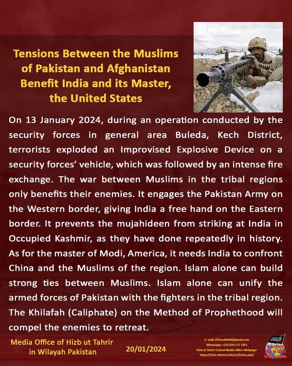 Mnamo tarehe 13 Januari 2024, wakati wa operesheni iliyofanywa na vikosi vya usalama katika eneo la jumla la Buleda, Wilaya ya Kech, magaidi walilipua Kifaa Kutengezezwa kienyeji cha Mlipuko kwenye gari la vikosi vya usalama, na kufuatiwa na makabiliano makali ya risasi. Vita kati ya Waislamu katika maeneo ya kikabila huwanufaisha tu maadui zao. Inashirikisha Jeshi la Pakistan kwenye mpaka wa Magharibi, na kuipa India uhuru kwenye mpaka wa Mashariki. Inawazuia mujahidina kuishambulia India katika Kashmir Inayokaliwa kimabavu, kama walivyofanya mara kwa mara katika historia. Kuhusu bwana wa Modi, Marekani, inaihitaji India kukabiliana na China na Waislamu wa eneo hilo. Uislamu peke yake unaweza kujenga mafungamano imara baina ya Waislamu. Uislamu pekee unaweza kuunganisha majeshi ya Pakistan na wapiganaji katika eneo la kikabila. Khilafah kwa Njia ya Utume itawalazimisha maadui kurudi nyuma.