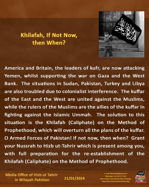 Marekani na Uingereza, viongozi wa ukafiri, sasa wanaishambulia Yemen, huku wakiunga mkono vita dhidi ya Gaza na Ukingo wa Magharibi. Hali katika nchi za Sudan, Pakistan, Uturuki na Libya pia zinatatizika kutokana na kuingiliwa na wakoloni. Makafiri wa Mashariki na Magharibi wameungana dhidi ya Waislamu, huku watawala wa Waislamu wakiwa ni washirika wa makafiri katika kupigana dhidi ya Umma wa Kiislamu. Suluhisho la hali hii ni Khilafah kwa Njia ya Utume, ambayo itapindua mipango yote ya makafiri. Enyi Wanajeshi wa Pakistan! Ikiwa sio sasa, basi lini? Ipeni Nusrah yenu Hizb ut-Tahrir iliyoko miongoni mwenu, yenye maandalizi kamili ya kusimamisha tena Khilafah kwa Njia ya Utume.