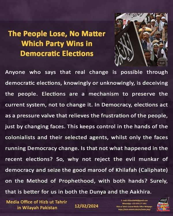 Baada ya uchaguzi nchini Pakistan, Msemaji wa Wizara ya Mambo ya Nje ya Marekani alitangaza mnamo tarehe 9 Februari, "Sasa tunatazamia kwa wakati unaofaa, matokeo kamili ambayo yanaakisi matakwa ya watu wa Pakistan." Kuanzia Morocco hadi Indonesia, uchaguzi unaakisi matakwa ya wakoloni, sio watu. Mstari mwekundu ni chochote wanachotaka wakoloni, na huyo anayeitwa mtawala yuko pale tu ili kutoa hakikisho. Katika Ulimwengu wa Kiislamu, mtawala halisi ndiye mkuu wa jeshi, au amiri jeshi mkuu, huku kamishna halisi wa uchaguzi ndiye mkuu wa ujasusi. Sasa ameshughulishwa na kupanga ziara za kuwatembelea wagombeaji wa uchaguzi, kwa kutumia hongo na vitisho, ili kuamua nyuso za serikali. Hakutakuwa na mabadiliko kutoka ndani ya mfumo huu. Unahitaji kung'olewa na kubadilishwa na Khilafah kwa Njia ya Utume.