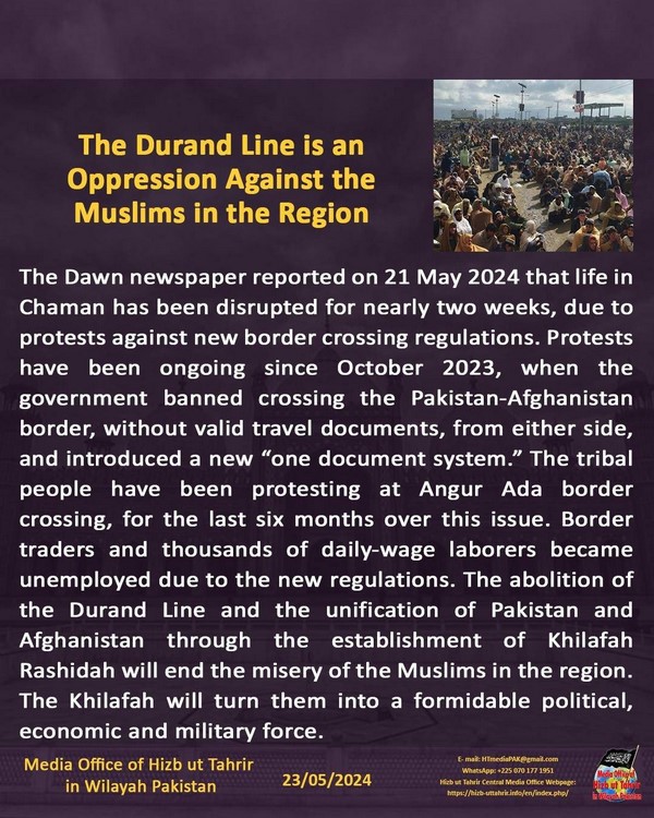 Gazeti la ‘The Dawn’ liliripoti mnamo tarehe 21 Mei 2024 kwamba maisha katika Chaman yametatizika kwa karibu wiki mbili, kutokana na maandamano dhidi ya kanuni mpya za kuvuka mpaka. Maandamano yamekuwa yakiendelea tangu Oktoba 2023, wakati serikali ilipopiga marufuku kuvuka mpaka wa Pakistan na Afghanistan, bila hati halali za kusafiria, kutoka pande zote mbili, na kuanzisha "mfumo mpya wa hati moja." Watu wa makabila wamekuwa wakiandamana katika kivuko cha mpaka cha Angur Ada, kwa miezi sita iliyopita juu ya suala hili. Wafanyibiashara wa mpakani na maelfu ya vibarua wanaolipwa kila siku walikosa ajira kutokana na kanuni hizo mpya. Kukomeshwa kwa Mstari wa Durand na kuunganishwa kwa Pakistan na Afghanistan kupitia kuasisiwa Khilafah Rashida kutamaliza masaibu ya Waislamu katika eneo hilo. Khilafah itawageuza kuwa kikosi cha kutisha cha kisiasa, kiuchumi na kijeshi.