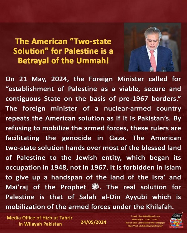 Tarehe 21 Mei, 2024, Waziri wa Mambo ya Nje alitoa wito wa "kuanzishwa kwa Palestina kama Dola tendakazi, salama na inayoshikamana na msingi wa mipaka ya kabla ya 1967." Waziri wa mambo ya nje wa nchi yenye silaha za nyuklia anarudia suluhisho la Marekani kana kwamba ni la Pakistan. Kwa kukataa kupeleka jeshi, watawala hawa wanawezesha mauaji ya halaiki huko Gaza. Suluhisho la dola mbili la Marekani linakabidhi sehemu kubwa ya ardhi iliyobarikiwa ya Palestina kwa umbile la Kiyahudi, ambalo lilianza ukaliaji wake wa kimabavu mnamo 1948, sio mnamo 1967. Ni marufuku katika Uislamu kutoa hata shubiri moja ya ardhi ya Isra' na Mi'raj ya Mtume ﷺ. Suluhisho la kweli kwa Palestina ni lile la Salah al-Din Ayyubi ambalo ni uhamasishaji wa majeshi chini ya Khilafah.