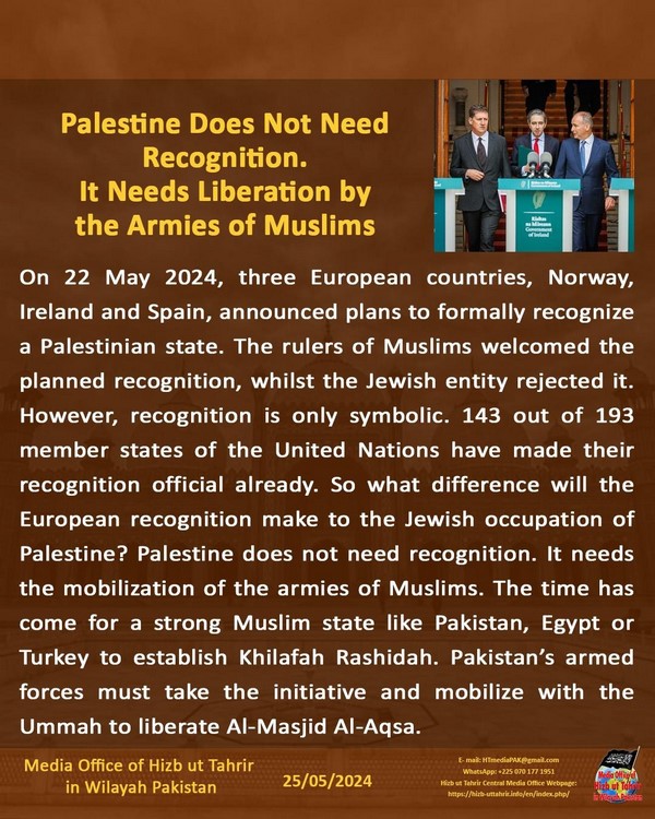 Tarehe 22 Mei 2024, nchi tatu za Ulaya, Norway, Ireland na Uhispania, zilitangaza mipango ya kuitambua rasmi dola ya Palestina. Watawala wa Waislamu walifurahia kutambuliwa kwa mpango huo, huku umbile la Kiyahudi lilikataa. Hata hivyo, kutambuliwa ni ishara tu. Nchi 143 kati ya 193 wanachama wa Umoja wa Mataifa tayari zimeshafanya rasmi utambuzi wao. Kwa hivyo utambuzi wa Ulaya utaleta tofauti gani kwa uvamizi wa Kiyahudi wa Palestina? Palestina haihitaji kutambuliwa. Inahitaji uhamasishaji wa majeshi ya Waislamu. Wakati umefika kwa dola yenye nguvu ya Kiislamu kama Pakistan, Misri au Uturuki kusimamisha Khilafah Rashida. Majeshi ya Pakistan lazima yachukue hatua na kusonga na Ummah kukomboa Al-Masjid Al-Aqsa.