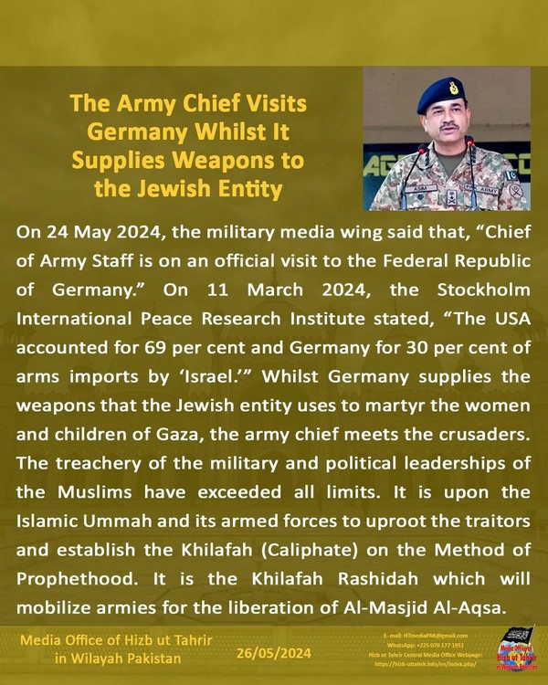 Mnamo tarehe 24 Mei 2024, mrengo wa vyombo vya habari vya kijeshi ulisema kwamba, "Mkuu wa Majeshi yuko katika ziara rasmi katika Jamhuri ya Shirikisho ya Ujerumani." Mnamo tarehe 11 Machi 2024, Taasisi ya Utafiti wa Amani ya Kimataifa ya Stockholm ilisema, "Marekani inachangia asilimia 69 na Ujerumani kwa asilimia 30 ya uagizaji wa silaha wa ‘Israel.’" Huku Ujerumani ikisambaza silaha ambazo umbile la Kiyahudi hutumia kuwaua wanawake na watoto wa Gaza, mkuu wa jeshi akutana na makruseda. Khiyana ya uongozi wa kijeshi na kisiasa wa Waislamu umevuka mipaka yote. Ni juu ya Umma wa Kiislamu na majeshi yake kuwang'oa wasaliti na kusimamisha Khilafah kwa Njia ya Utume. Ni Khilafah Rashida ndiyo itakayokusanya majeshi kwa ajili ya ukombozi wa Al-Masjid Al-Aqsa.