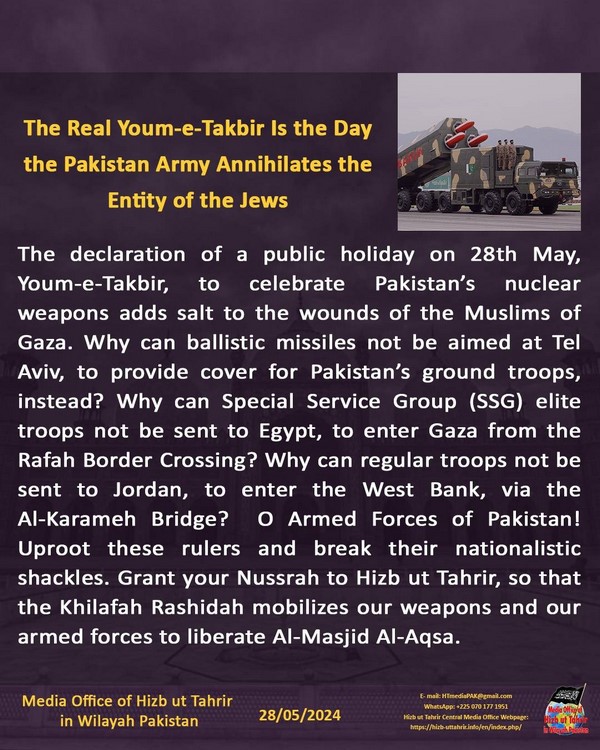 Tangazo la likizo ya umma mnamo tarehe 28 Mei, Youm-e-Takbir, kusherehekea silaha za nyuklia za Pakistan linaongeza chumvi kwenye majeraha ya Waislamu wa Gaza. Kwa nini makombora ya balistiki hayawezi kulenga Tel Aviv, ili kutoa ulinzi kwa wanajeshi wa ardhini wa Pakistan, badala yake? Kwa nini kipote cha wanajeshi wa Kikundi cha Huduma Maalum (SSG) hawawezi kutumwa Misri, kuingia Gaza kupitia Kivuko cha Mpakani cha Rafah? Kwa nini wanajeshi wa kawaida hawawezi kutumwa Jordan, kuingia Ukingo wa Magharibi, kupitia Daraja la Al-Karameh? Enyi Wanajeshi wa Pakistan! Ng'oeni watawala hawa na kuvunja minyororo yao ya utaifa. Ipeni Nusrah yenu Hizb ut Tahrir, ili Khilafah Rashida ikusanye silaha zetu na majeshi yetu kukomboa Al-Masjid Al-Aqsa.