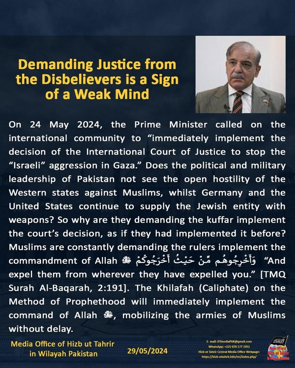 Mnamo tarehe 24 Mei 2024, Waziri Mkuu alitoa wito kwa jumuiya ya kimataifa "kutekeleza mara moja uamuzi wa Mahakama ya Kimataifa ya Haki ya kukomesha uchokozi wa "Israel" huko Gaza. Je, uongozi wa kisiasa na kijeshi wa Pakistan hauoni uadui wa wazi wa mataifa ya Magharibi dhidi ya Waislamu, huku Ujerumani na Marekani zikiendelea kulipatia umbile la Kiyahudi silaha? Hivi kwa nini wanadai makafiri watekeleze uamuzi wa mahakama, kana kwamba walishawahi kuutekeleza hapo awali? Waislamu daima wanawataka watawala kutabikisha amri ya Mwenyezi Mungu ﷻ