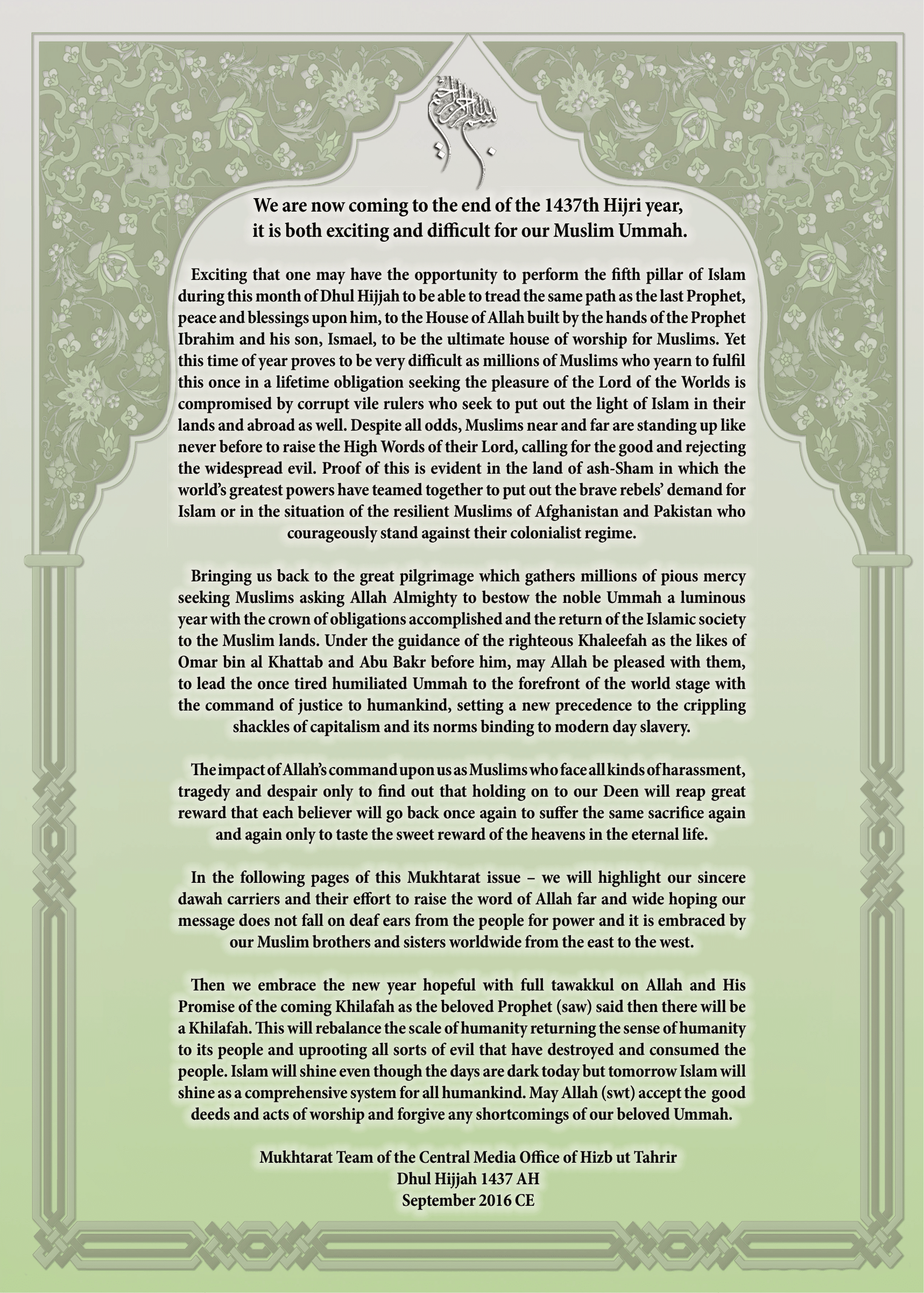 Toleo 44 Dhu al-Hijjah 1437 H - Septemba 2016 M