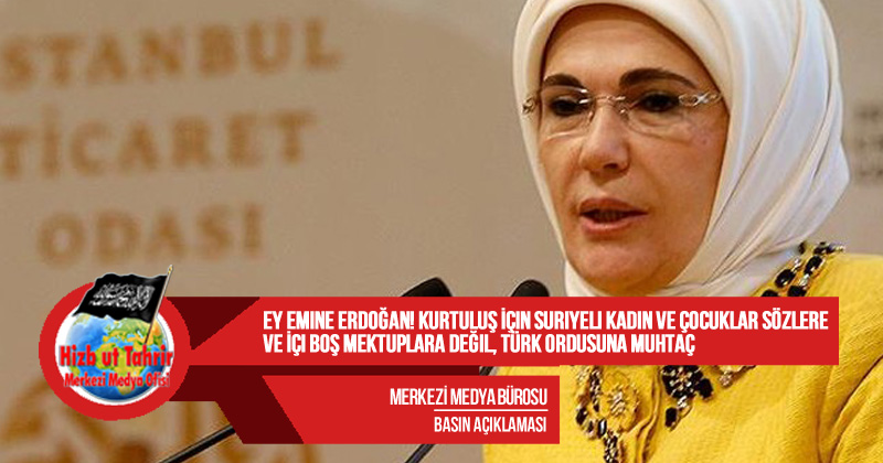 Ey Emine Erdoğan! Eğer gerçekten samimi ve dürüstseniz ve vicdanınız da daha fazla acıyı kaldıramıyorsa, o zaman İslam ümmeti ile birlikte olmak, İslami görevini yerine getirmek, sömürgeci Batı güçlerle yaptığı iğrenç koalisyonu sona erdirmek üzere eşinize bir çağrıda bulunun. Ki Suriyeli Müslümanları savunmak ve onları bu “Esed” kasabından kurtarmak için göğsünü gere gere övündüğü bu orduları derhal seferber etsin. Hem onları desteklesin hem de Müslümanların hamisi ve kalkanı olan Nübüvvet metodu üzere Raşidi Hilafet Devletinin kurulması çalışmasında İslam ümmetini desteklesin. Zira Hilafet, bu ümmete güvenlik, refah ve izzet sağlamakta benzersiz bir vaka sunacaktır. Allah Subhânehu ve Teâlâ şöyle buyuruyor: