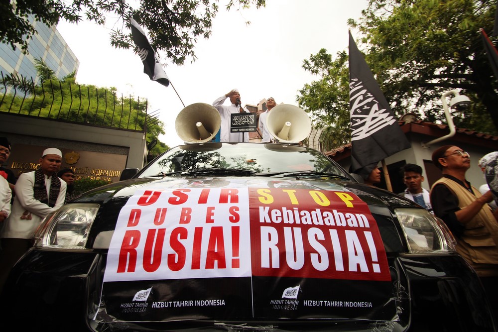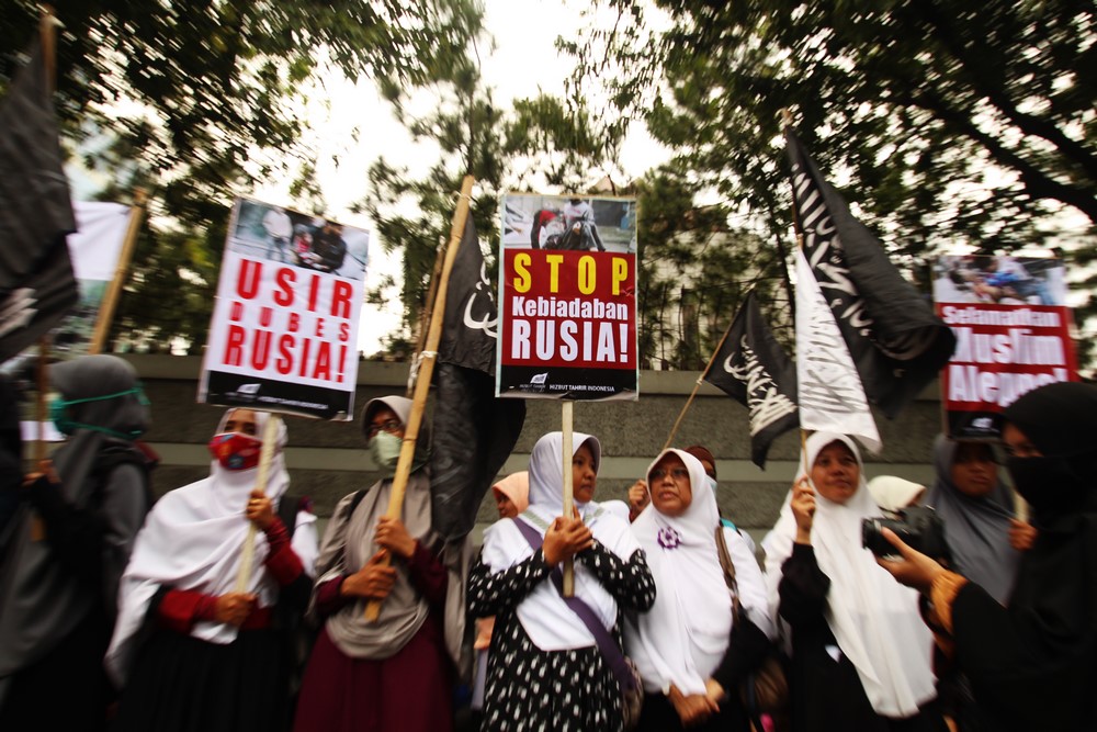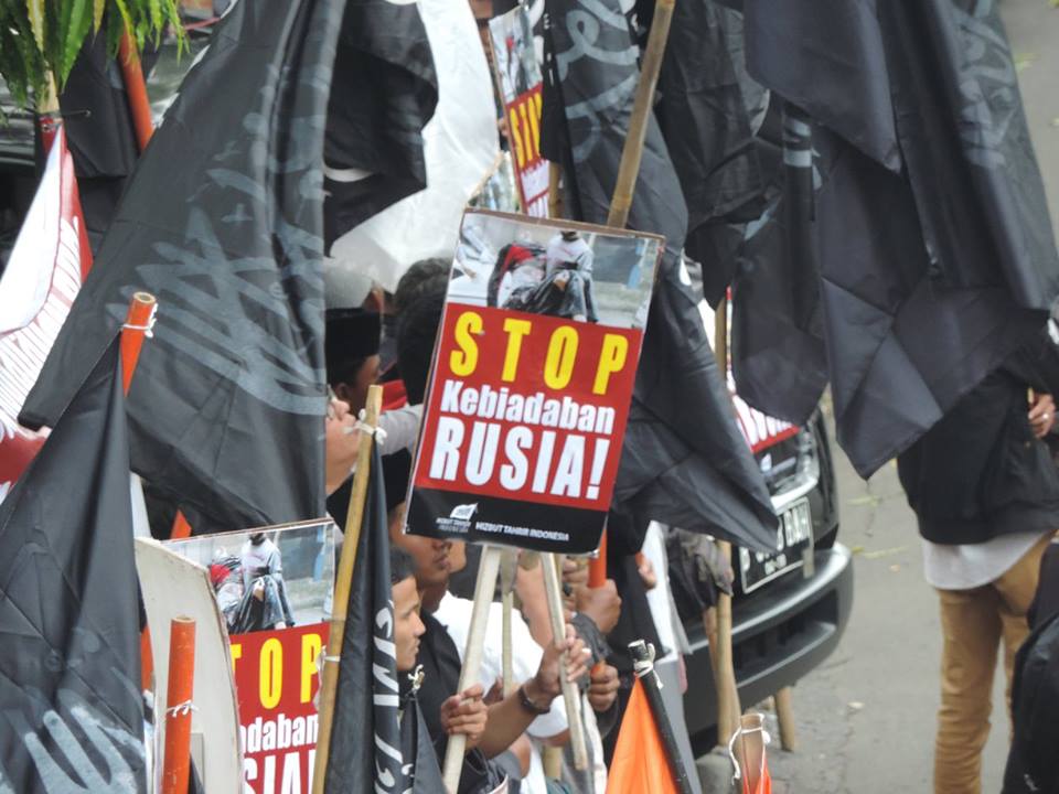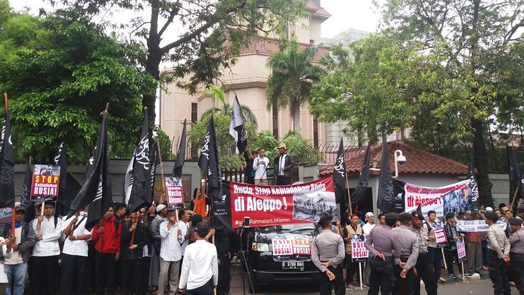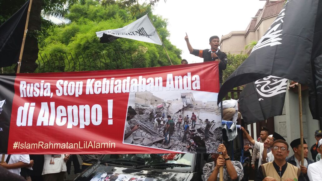 Hizb-ut Tahrir / Endonezya, Beşar rejimi ve paralı askerleri tarafından işlenen acımasız suçları ve herkesin, canlı olan her şeyin yanmasına yol açan Rus hava saldırılarına karşı çıkmak için Cakarta'daki Rus Büyükelçiliği önünde bir basın açıklaması okumak da dahil olmak üzere bir protesto gerçekleştirdi. Protesto ile, tüm dünya pasif olarak katliamları izlerken yok olan #Halep'deki halkımıza destek verildi. Protestoda, Suriye'deki halkımızın katledilişini parmağını dahi kaldırmadan hareketsiz bekleyen ve izleyen Müslüman dünyadaki mevcut rejimler kınandı. Basın açıklamasında, bu insan yapımı rejimleri devirmek ve kalıntıları üzerine; tek başına İslam'ı ve Müslümanları savunabilecek Nübüvvet metodu üzerine Raşidi Hilâfet Devleti'ni kurmak için çağrıda bulunuldu.