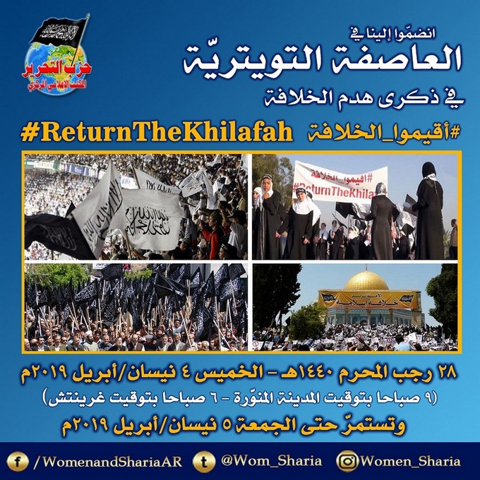 1440 - 2019 Recep ayı boyunca Hizb-ut Tahrir dünyanın dört bir tarafında Hilafetin yıkılışının yıldönümü olan 3 Mart 1924 - 28 Recep 1342 H tarihine mutakiben etkinlikler düzenledi. Biz, Hizb-ut Tahrir Medya Ofisi olarak bu sayfada etkinliklere ait bilgileri paylaştık. Allah'tan Nübüvvet minhacı üzere Raşidi Hilafetin ikamesini hızlanmasını niyaz ediyoruz. Şüphesiz bu Allah için zor değildir.