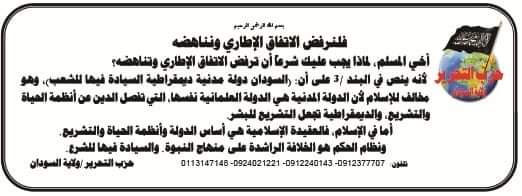 "Ey Müslüman kardeşim, neden çerçeve anlaşmasını yasal olarak reddetmek ve karşı çıkmak zorundasın? Çünkü birinci / üçüncü maddede "Sudan, egemenliğin halka ait olduğu sivil ve demokratik bir devlettir" ifadesi yer almaktadır. Bu İslam'a aykırıdır çünkü sivil devlet demokratik laiktir. Laiklik, dini hayattan ayırır ve demokrasi insanlar için yasama yapar. İslam'a gelince, İslam Akidesi devletin, hayat nizamının ve yasamanın temelidir ve hükümet sistemi Nübüvvet metodu üzere Raşidi Hilafettir ve onda egemenlik Şeriat içindir."
