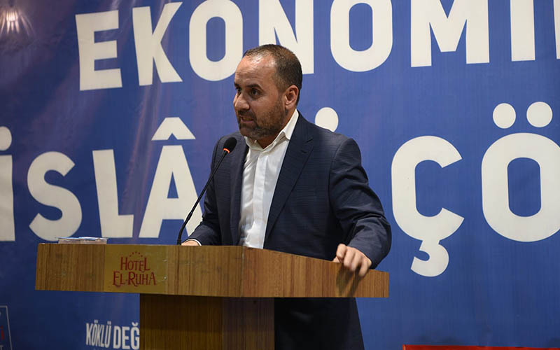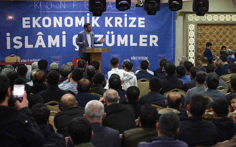 Köklü Değişim Yazarı Mehmet Göçmen'in moderatörlüğünde Şanlıurfa El Ruha Oteli Salonu'nda  gerçekleştirilen "Ekonomik Krizlere İslâmî Çözümler" başlıklı konferans Kuran tilavetiyle başladı.
