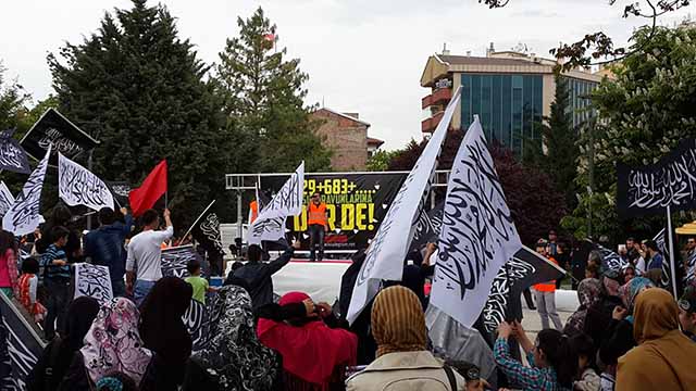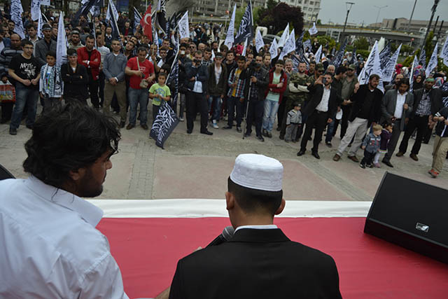 “Kerim kardeşlerim, bizler onlarca yıldır kardeşlerimize yapılan zulümleri kınamak ve gündem etmek için bir araya geliyoruz. Bizler gibi bu amaçla toplanan tüm kardeşlerimize de buradan sesleniyoruz. Artık sizlerde Hilafeti talep edin, İslam ile yönetmeyen yöneticilerinizi, bunu yapmadıkları için muhasebe edin. Bu zulümler Halifemiz, Hilafetimiz olmadan bitmeyecektir. Tek çözüm ve kurtuluş budur.”