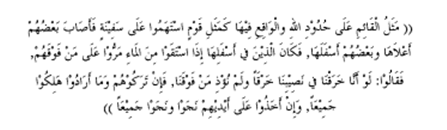 "Allah'ın hadleri üzere kaim olanların ve içerisinde bulundukları vâkıanın misâli, bir gemi üzerinde kura çeken bir kavmin misâlidir. Nitekim (kura sonucu) bazılarına (geminin) üst katı, bazılarına da alt katı isâbet eder (çıkar). Suya susadıkları zaman, (yukarı çıkmak için) üsttekilerin arasından geçmek zorunda olan alttakiler, "üstümüzdekilere eziyet vereceğimize, bir delik açıp yerimizi delelim" derler, (üsttekiler de) onları (kendi hallerine) terk ederlerse, hep birlikte helâk olurlar. (Engellemek için) ellerinden tutarlarsa kurtulurlar, hep birlikte kurtulurlar." (Buhari, K. Şeriket, 2313)