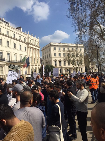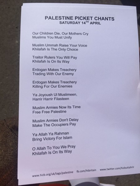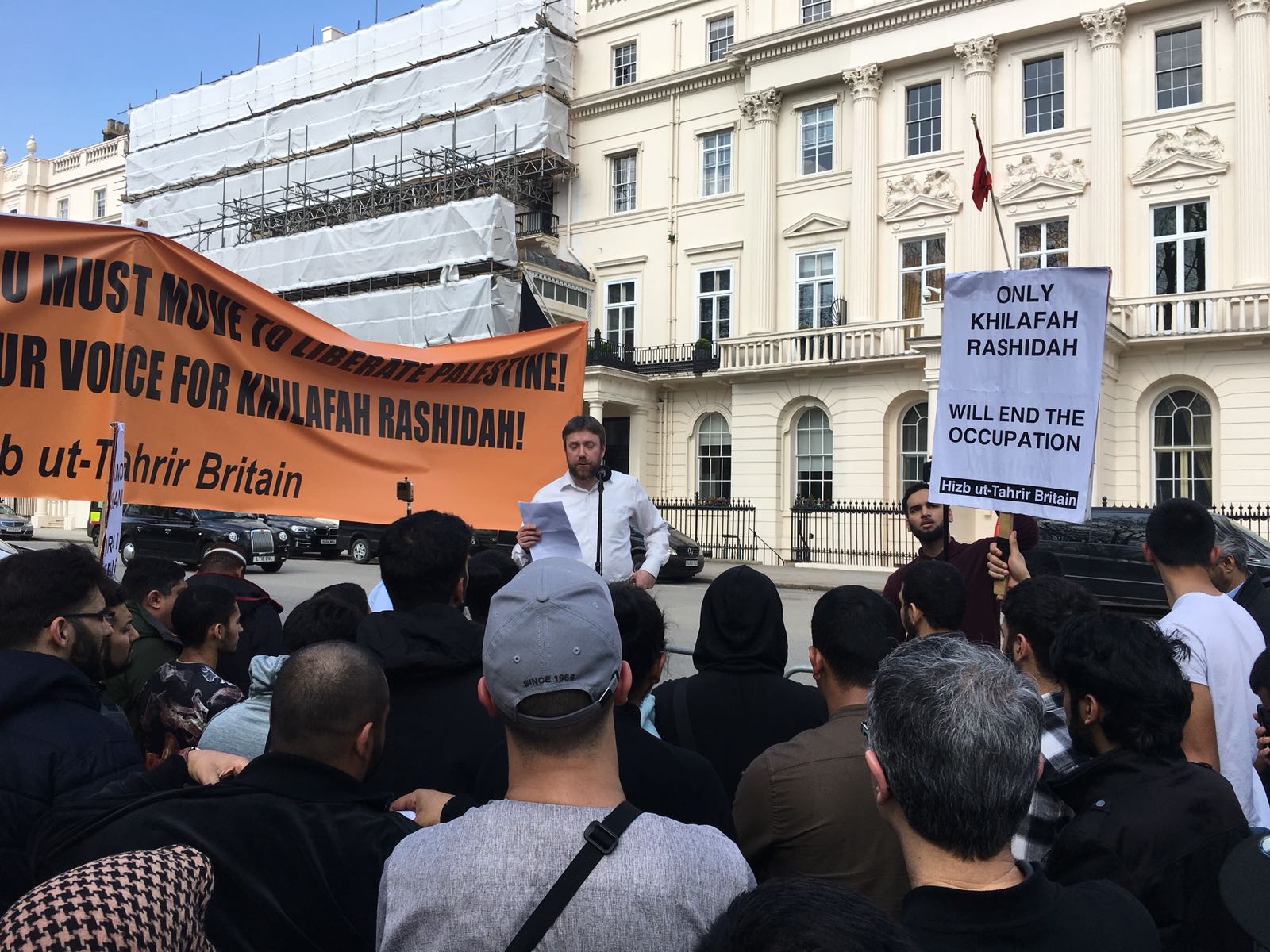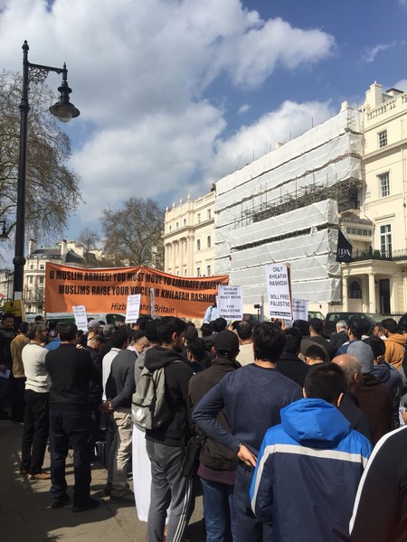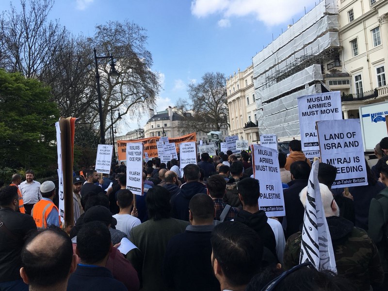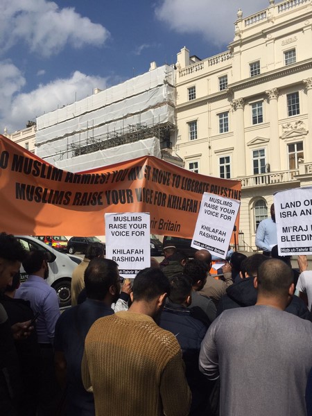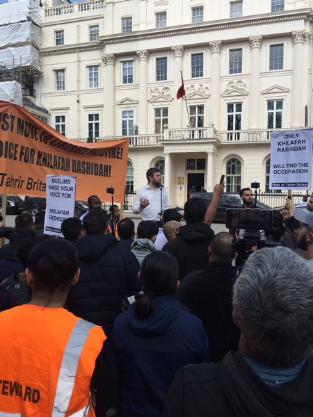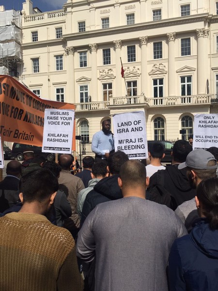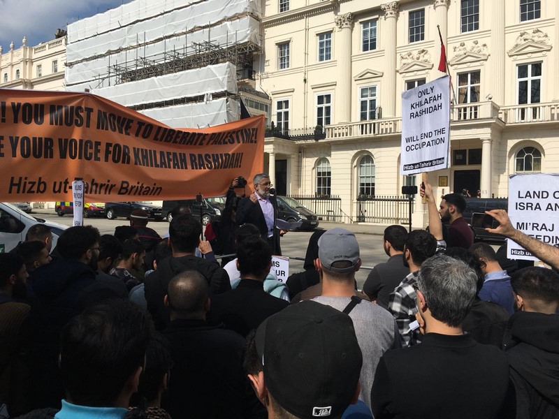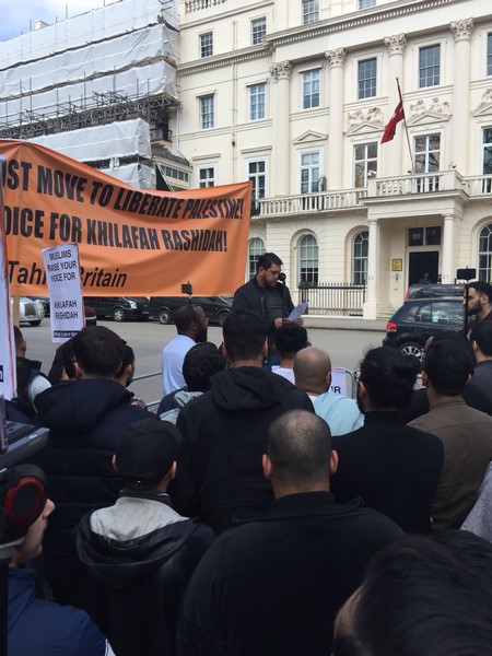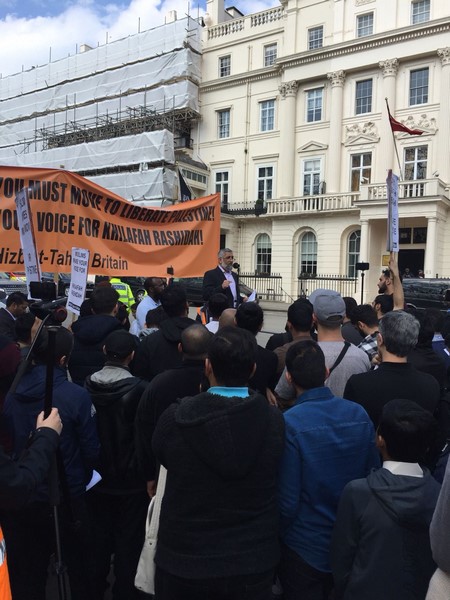 حزب التحریر نے لندن برطانیہ میں ترکی کی ایمبیسی کے سامنے مبارک سرزمینِ فلسطین کے مسلمانوں کے ساتھ یکجہتی کیلئے اور 28 رجب یومِ سقوطِ خلافت کے موقع پر اُمتِ مسلمہ کو خلافتِ راشدہ کے قیام کیلئے جگانے اور دوسری ریاستِ خلافت کے قیام کے جزبے کو تیز کرنے کیلئے  عالمی مہم کا حصہ بنتے  ہوےدھرنا دیا ۔دھرنا تین  مرکزی تقاریرپر مشتمل تھا، پہلی تقریر اسرا ءو معراج کے بارے میں تھی،دوسری  مسلم حکمرانوں کی غداری کے بارے میں خاص طور پر ترکی کے حکمرانوں کی  فلسطین اور مسلمانوں سے غداری سے متعلق تھی کہ یہ حکمران یہودی ریاست کے ساتھ معاشی، سیاحتی اور عسکری تعلقات استوار کرنے کیلئے دن رات ایک کیئے ہوے ہیں۔ تیسری تقریر مبارک سرزمینِ فلسطین کے مسلے کے حل سے متعلق تھی جسکے مطابق اسکا حل وہی ہے جو صلاح الدین ؒ نے کیا یعنی آزاد کروایا اور یہ نبوت کی طرز پر خلافتِ راشدہ کے دوبارہ قیام سے ہی ممکن ہے۔