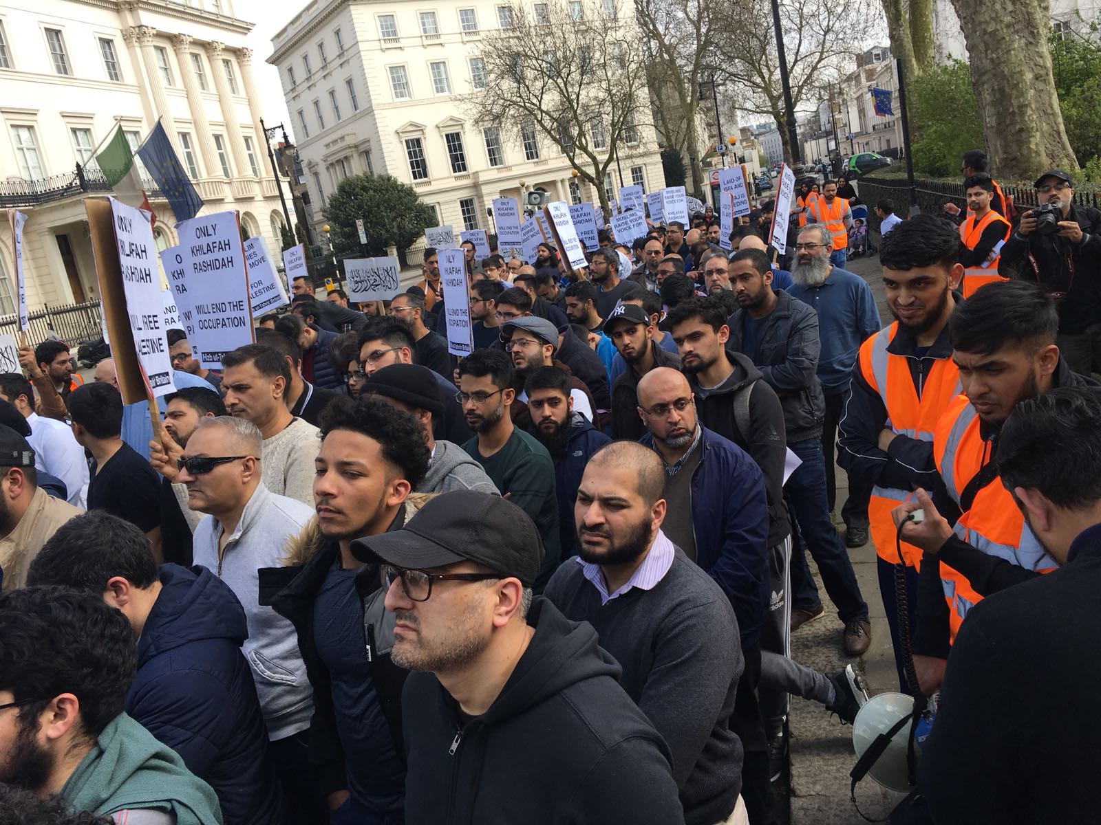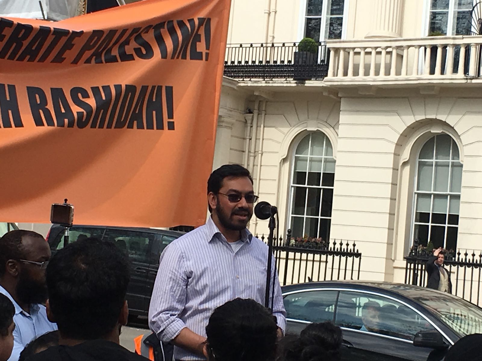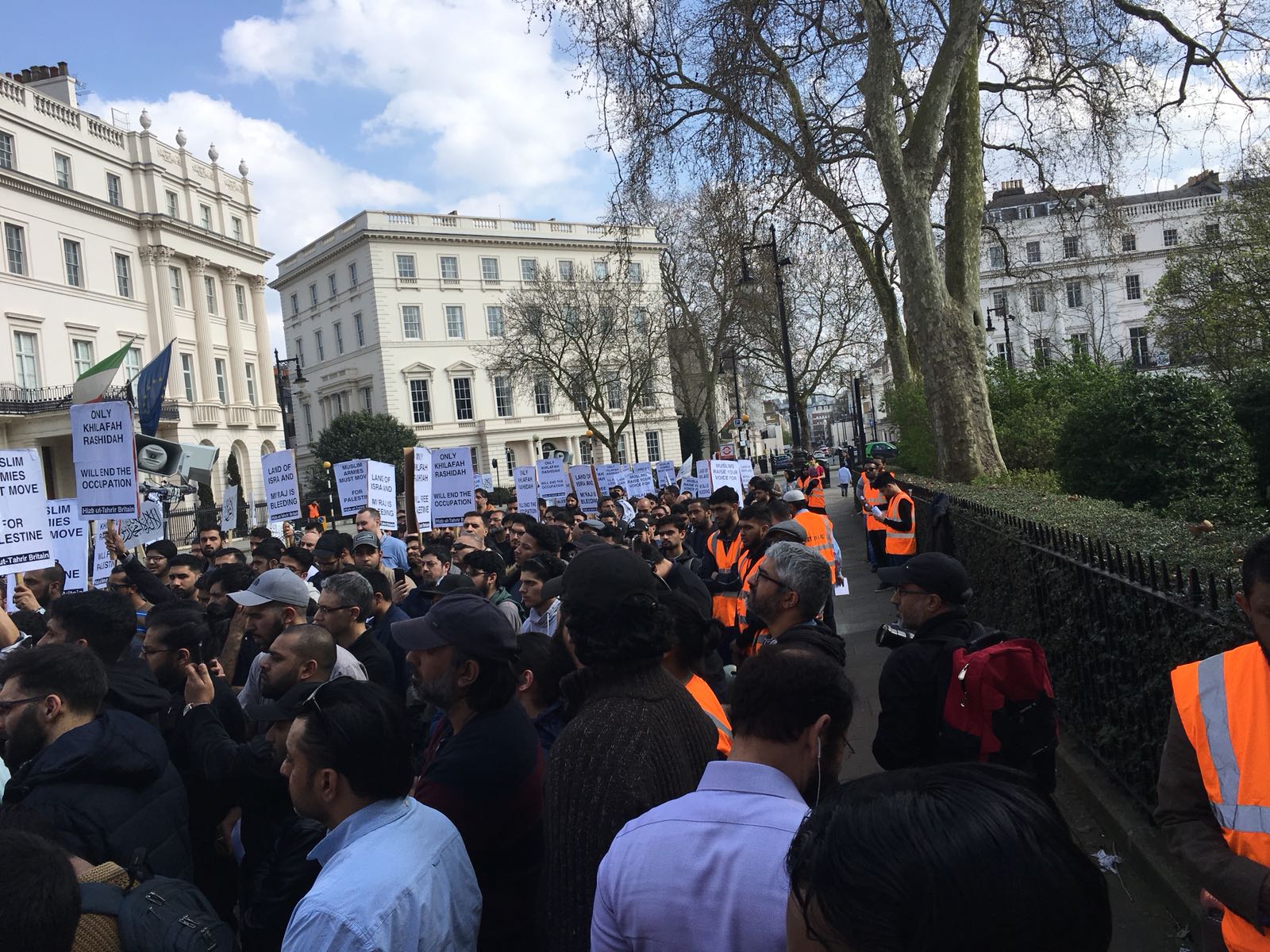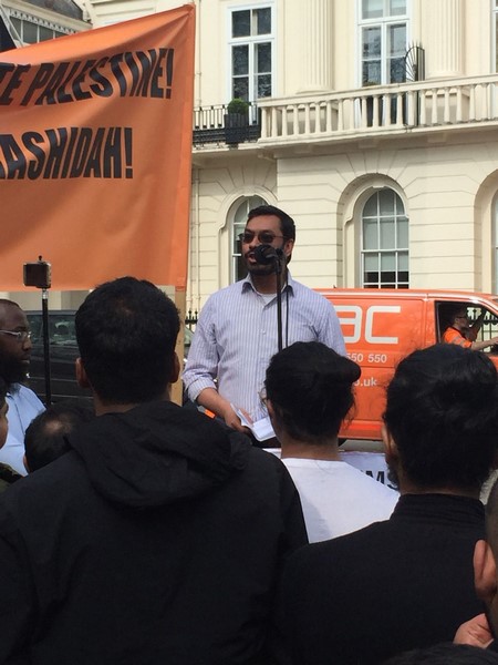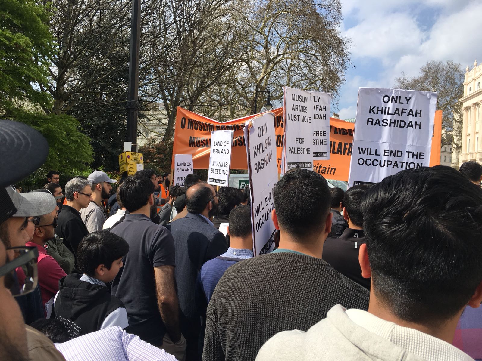 حزب التحریر نے لندن برطانیہ میں ترکی کی ایمبیسی کے سامنے مبارک سرزمینِ فلسطین کے مسلمانوں کے ساتھ یکجہتی کیلئے اور 28 رجب یومِ سقوطِ خلافت کے موقع پر اُمتِ مسلمہ کو خلافتِ راشدہ کے قیام کیلئے جگانے اور دوسری ریاستِ خلافت کے قیام کے جزبے کو تیز کرنے کیلئے  عالمی مہم کا حصہ بنتے  ہوےدھرنا دیا ۔دھرنا تین  مرکزی تقاریرپر مشتمل تھا، پہلی تقریر اسرا ءو معراج کے بارے میں تھی،دوسری  مسلم حکمرانوں کی غداری کے بارے میں خاص طور پر ترکی کے حکمرانوں کی  فلسطین اور مسلمانوں سے غداری سے متعلق تھی کہ یہ حکمران یہودی ریاست کے ساتھ معاشی، سیاحتی اور عسکری تعلقات استوار کرنے کیلئے دن رات ایک کیئے ہوے ہیں۔ تیسری تقریر مبارک سرزمینِ فلسطین کے مسلے کے حل سے متعلق تھی جسکے مطابق اسکا حل وہی ہے جو صلاح الدین ؒ نے کیا یعنی آزاد کروایا اور یہ نبوت کی طرز پر خلافتِ راشدہ کے دوبارہ قیام سے ہی ممکن ہے۔